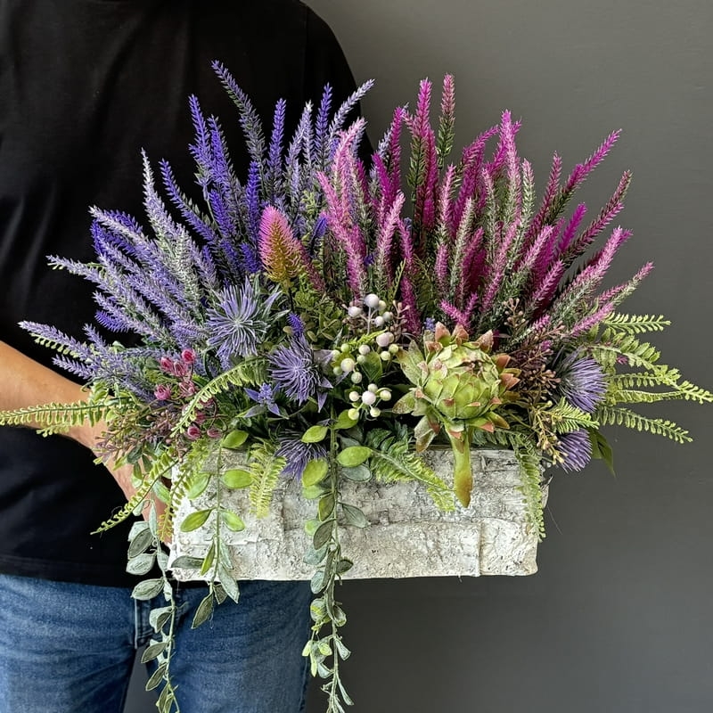 Sztuczne wrzosy osadzone w drewnianej donicy pokrytej fragmentami kory to stylowa i trwała dekoracja. Nasza propozycja to połączenie różnych rodzajów wrzosów w jednej donicy, uzupełnionych jesiennymi dodatkami. Piękne, zestawienie odcieni i faktur. Oryginalna, drewniana donica dodatkowo obciążona cementem doskonale współgra z naturalnym wyglądem sztucznych wrzosów, co stanowi niezwykle harmonijne połączenie. Doskonale sprawdzają się jako element dekoracyjny, zarówno wewnątrz, jak i na zewnątrz pomieszczeń. Ich wyjątkowy urok i różnorodność kolorów stanowią cenne walory estetyczne dla każdego miejsca, w którym są umieszczone. Często wykorzystywane przez naszych klientów jako kompozycja nagrobna.