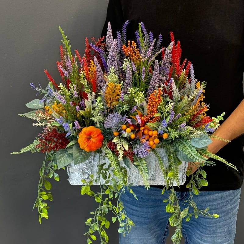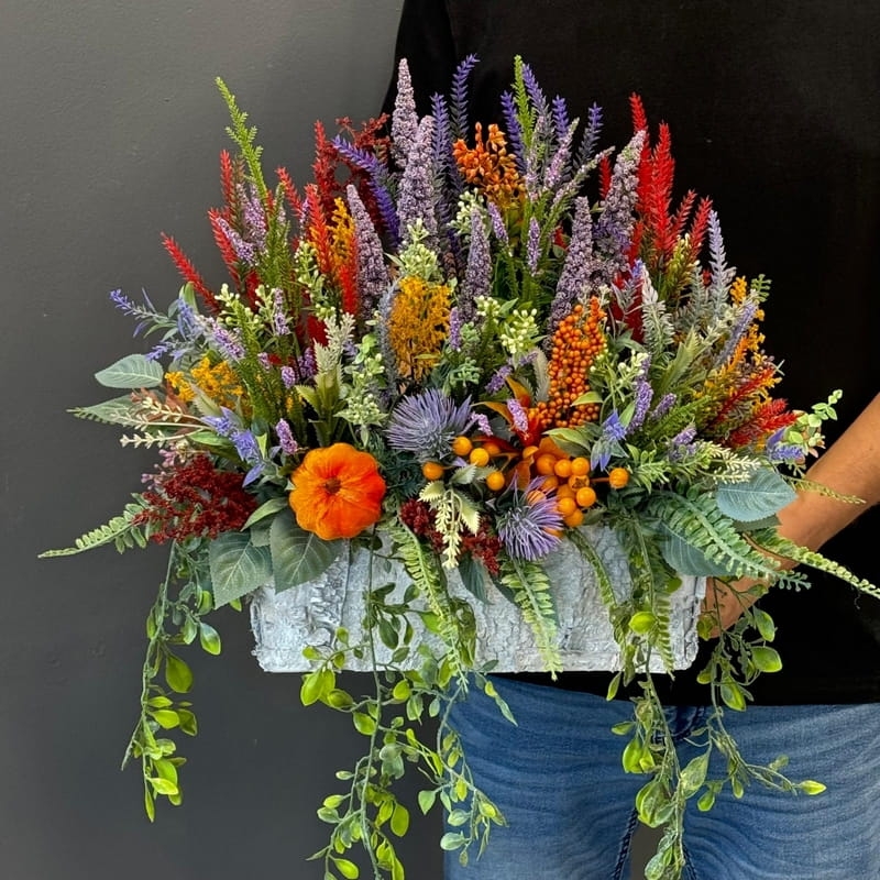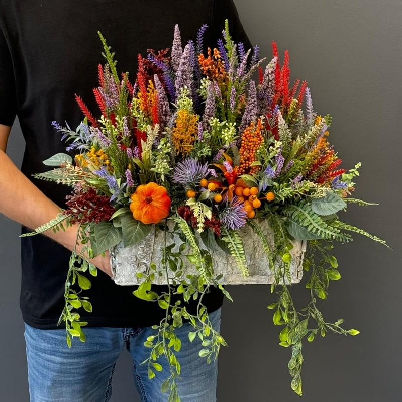 Sztuczne wrzosy osadzone w drewnianej donicy pokrytej fragmentami kory to stylowa i trwała dekoracja. Nasza propozycja to połączenie różnych rodzajów wrzosów w jednej donicy, uzupełnionych jesiennymi dodatkami. Piękne, zestawienie odcieni i faktur. Oryginalna, drewniana donica dodatkowo obciążona cementem doskonale współgra z naturalnym wyglądem sztucznych wrzosów, co stanowi niezwykle harmonijne połączenie. Doskonale sprawdzają się jako element dekoracyjny, zarówno wewnątrz, jak i na zewnątrz pomieszczeń. Ich wyjątkowy urok i różnorodność kolorów stanowią cenne walory estetyczne dla każdego miejsca, w którym są umieszczone. Często wykorzystywane przez naszych klientów jako kompozycja nagrobna.