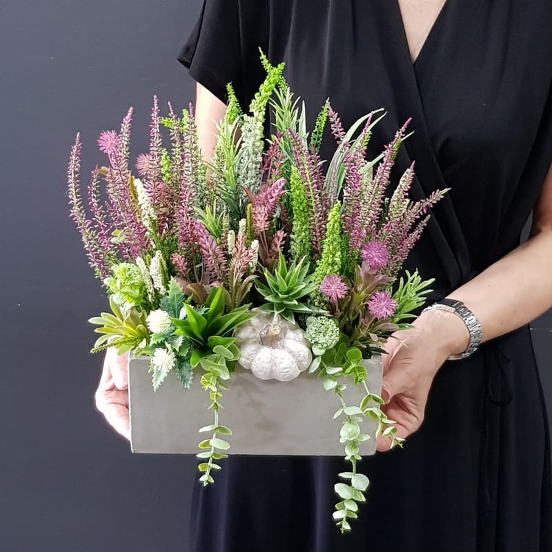 Oryginalna, kwiatowa kompozycja wykonana z wysokiej jakości roślin sztucznych i dodatków. Całość jest stworzona z dbałością o najdrobniejszy szczegół. Podstawę stanowi ceramiczna, lekko postarzana donica. Wszystkie dodatki są idealnie dopasowane kolorystycznie tak, aby tworzyły spójną całość. Kompozycja nadaje się zarówno do postawienia na parapecie, komodzie czy na tarasie. Sprawdzi się również jako wyjątkowa i niebanalna dekoracja nagrobna. Idealna do sesji fotograficznych.