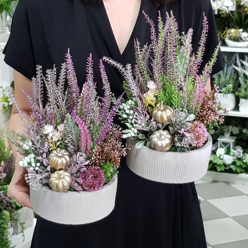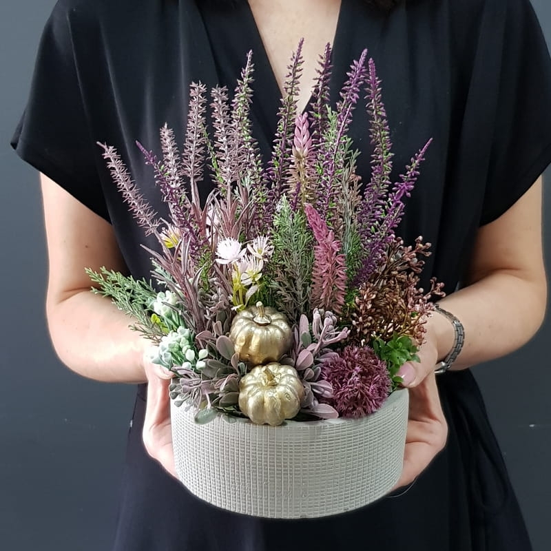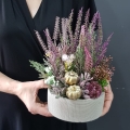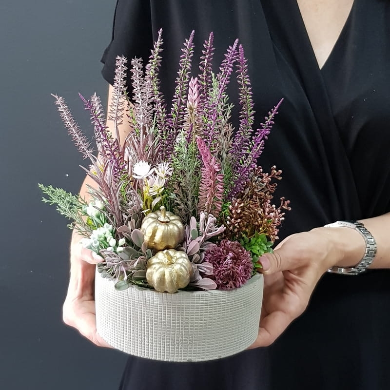 Oryginalna, kwiatowa kompozycja wykonana z wysokiej jakości roślin sztucznych i dodatków. Całość jest stworzona z dbałością o najdrobniejszy szczegół. Podstawę stanowi ceramiczna, lekko postarzana donica. Wszystkie dodatki są idealnie dopasowane kolorystycznie tak, aby tworzyły spójną całość. Kompozycja nadaje się zarówno do postawienia na parapecie, komodzie czy na tarasie. Sprawdzi się również jako wyjątkowa i niebanalna dekoracja nagrobna. Idealna do sesji fotograficznych.