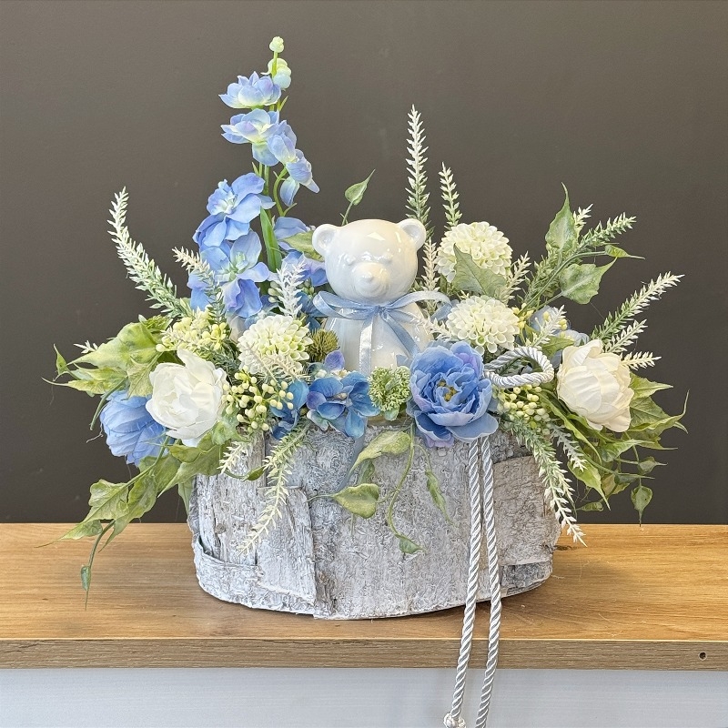 Delikatna i subtelna dekoracja nagrobna stworzona z myślą o najmłodszych. Kompozycja łączy stonowane odcienie kwiatów tworząc harmonijną i pełną ciepła całość. Centralnym punktem aranżacji jest figurka misia – symbol utraconego dzieciństwa, beztroski i niewinności – otoczona kwiatami w pastelowej kolorystyce. W stroiku zastosowano wysokiej jakości sztuczne kwiaty o naturalnym wyglądzie, w tym drobne róże, mini peonie, hortensje oraz delikatne akcenty eukaliptusa, które nadają kompozycji lekkości i elegancji.
