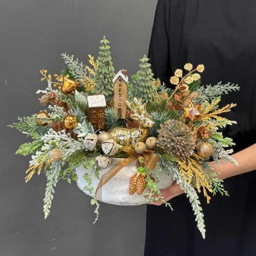 Całość osadzono w stylowej donicy ceramicznej lub dekoracyjnej, co zapewnia stabilność i estetyczne wykończenie, a jednocześnie pozwala ustawić dekorację na stole, komodzie, parapecie czy półce. Kompozycja idealnie sprawdzi się jako stroik świąteczny nie tylko w domu, ale także w biurze czy recepcji, gdzie elegancja i blask będą przyciągać wzrok. To także wyjątkowy pomysł na prezent bożonarodzeniowy — gotowa, efektowna dekoracja, która zachwyci każdego odbiorcę.