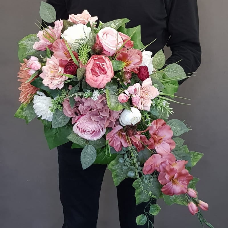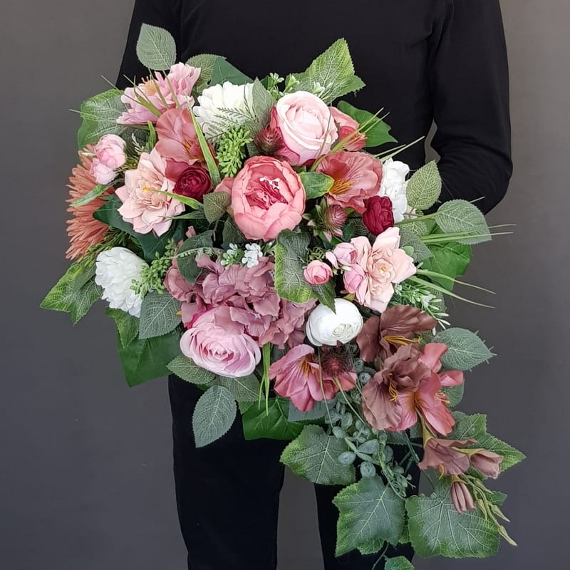 Dekoracja funeralna w postaci kompozycji na płytę nagrobkową. Postawa wykonana z tworzywa sztucznego, dodatkowo obciążona cementem, wypełniona dużą ilością kwiatów, liści i roślinnych dodatków w przepięknej, stonowanej kolorystyce. Kompozycja ma kształt wydłużonej kropli.