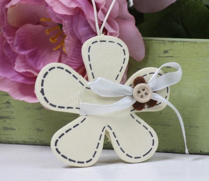 Oryginalna, drewniana zawieszka w kształcie kwiatka ozdobionego guzikiem i dekoracyjną kokardką. Ten subtelny gadżet doda uroku każdemu wnętrzu. Może posłużyć za samodzielną ozdobę lub stanowić oryginalny dodatek do prezentu. Szczególnie pięknie będzie się prezentował we wnętrzach utrzymanych w stylu retro. Kolekcję uzupełniają inne ozdoby z tej serii w różnych kolorach. W danych technicznych podajemy wymiar samej ozdoby, bez zawieszki.