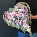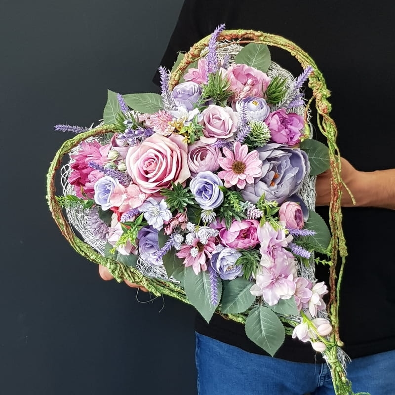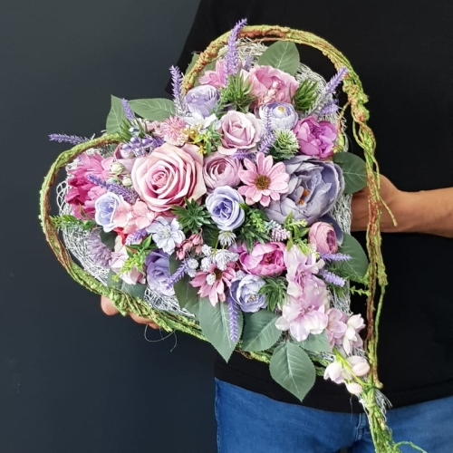 Dekoracja funeralna w postaci kwiatowego serca, gotowego do umieszczenia na płycie nagrobkowej. Postawa serca jest wykonana na stelażu pokrytym naturalną faszyną. Została dodatkowo obciążona cementem i wypełniona dużą ilością kwiatów w przepięknej, stonowanej kolorystyce. Szczególnego uroku dodają jej korzenie, uwydatniające i podkreślające kształt serca.