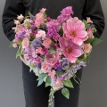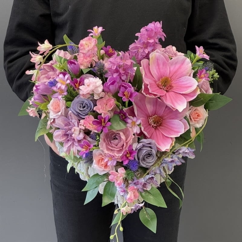 Dekoracja nagrobna w kształcie serca wypełnionego starannie dobranymi wiosennymi kwiatami. W kompozycji dominują okazałe kwiaty magnolii, których delikatne płatki tworzą efekt elegancji i subtelnego piękna. Wśród nich rozmieszczone zostały drobniejsze rośliny sezonowe, dodające aranżacji lekkości i świeżości.