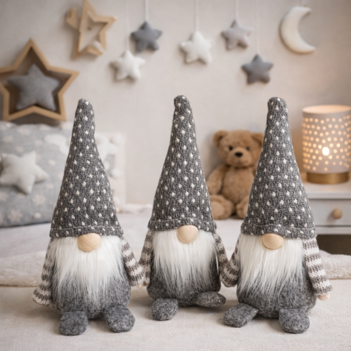Stylowy skrzat w odcieniach szarości z czapką w urocze kropeczki. Posiada obciążenie w dolnej części, co sprawia, że siedzi stabilnie i nie spada. Sprawdzi się jako całoroczna dekoracja mieszkania zarówno w klasycznym, jak i nowoczesnym stylu. Polecam jako doskonały pomysł na prezent.