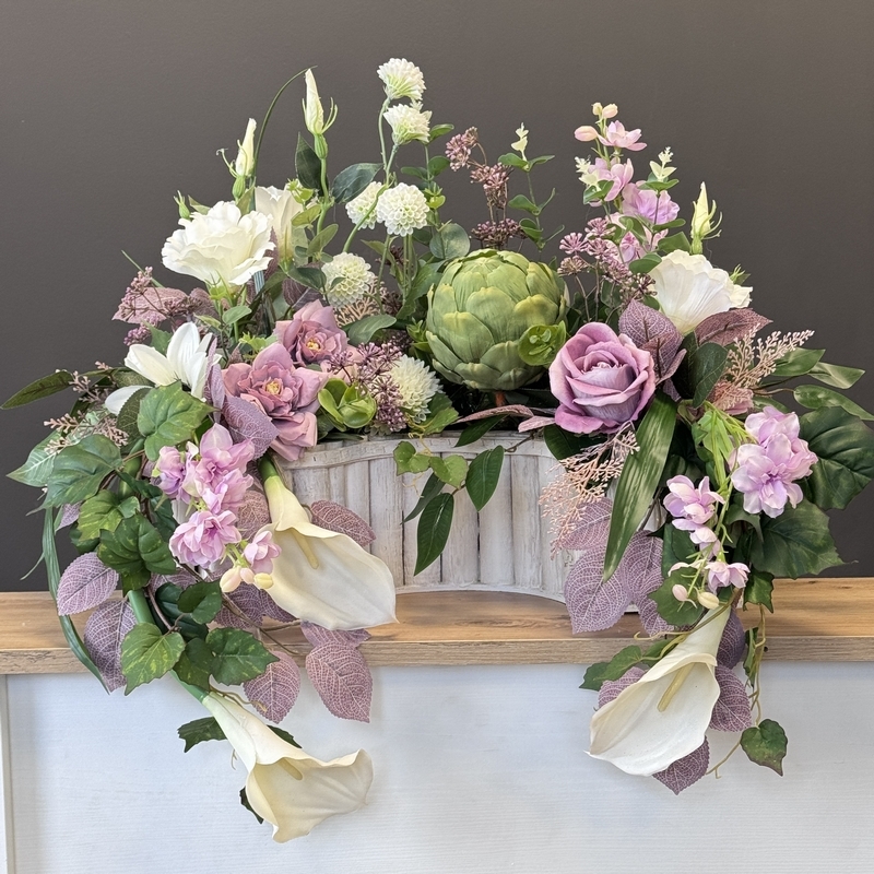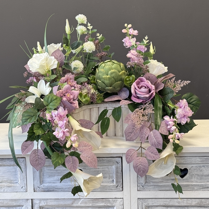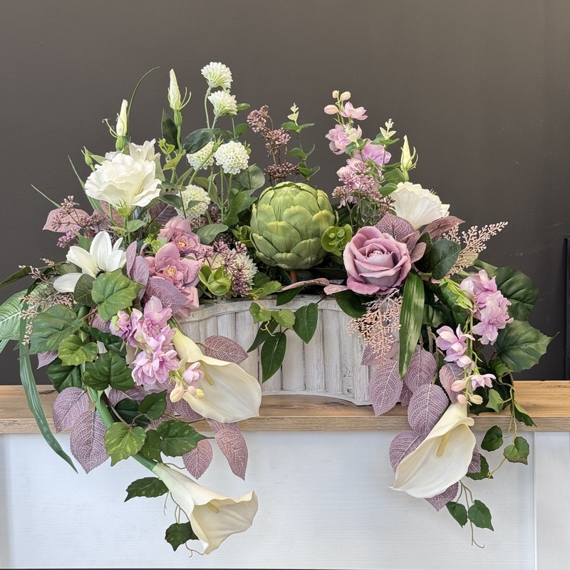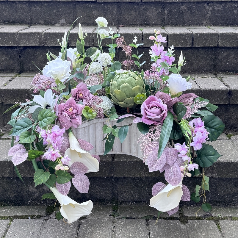 Elegancka i starannie wykonana kompozycja nagrobna, przygotowana z wysokiej jakości kwiatów sztucznych. Całość wypełniają m.in. pokaźna protea, ostróżki, pełniki, dalie, róże, czosnki, a także subtelne roślinne dodatki, bluszcz, liście róży, które nadają jej naturalnego i bogatego charakteru. Całość osadzona w obciążonej cementem donicy z drewna w kształcie półokręgu. Kompozycja jest stworzona z dbałością o najdrobniejszy szczegół. Wszystkie elementy są idealnie dopasowane kolorystycznie tak, aby tworzyły spójną całość. Poszczególne kompozycje mogą minimalnie różnić się rozkładem i rodzajami kwiatów, w zależności od dostępności, jednak kolorystyka i efekt końcowy są zawsze zachowane.