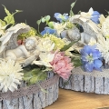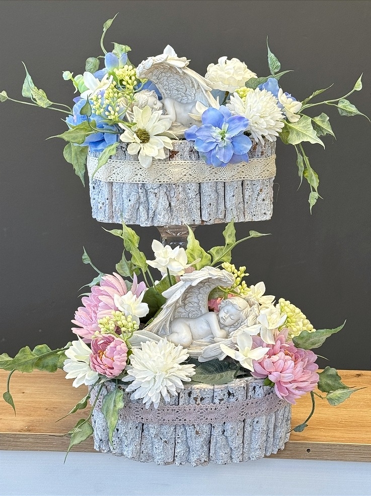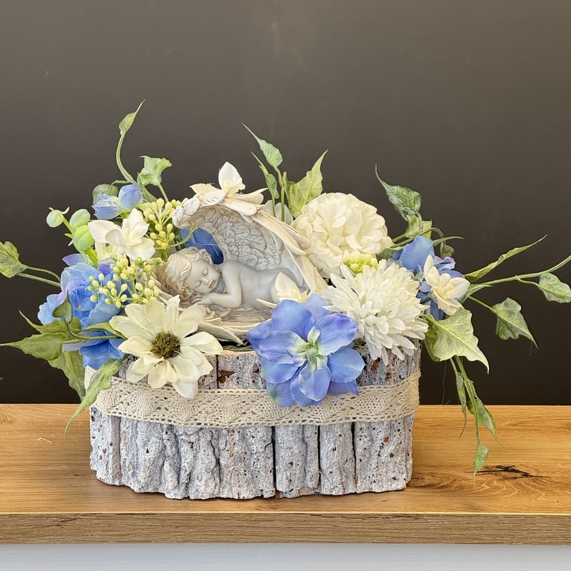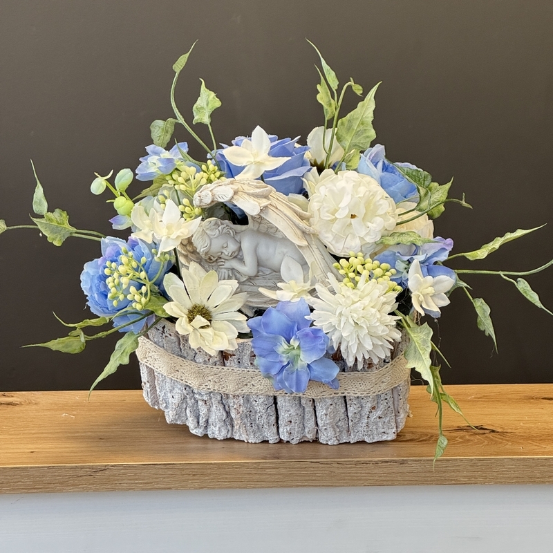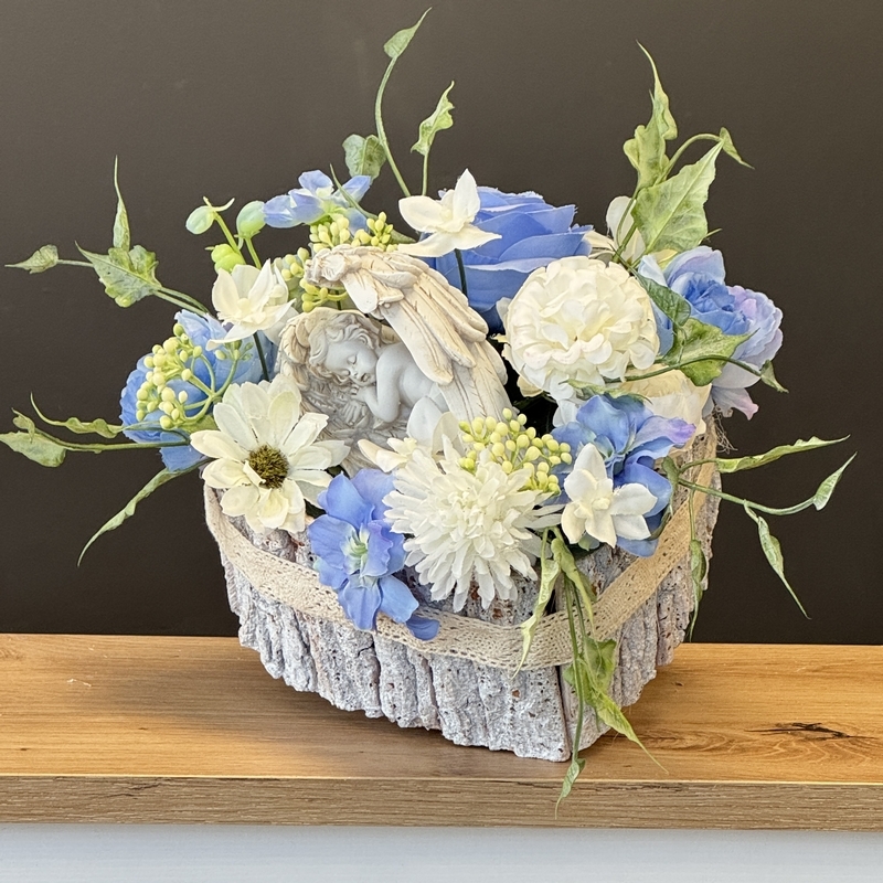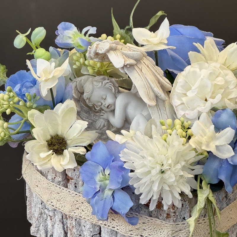 Subtelna dekoracja nagrobna w kształcie serca, wypełniona delikatnymi kwiatami w pastelowych odcieniach, kryje w swoim wnętrzu wyjątkowy symbol – figurkę śpiącego aniołka chłopca. Anioł od wieków utożsamiany jest z czystością, niewinnością oraz opieką nad tymi, którzy odeszli zbyt wcześnie. W tej kompozycji symbolizuje utracone dzieciństwo, które zostało przerwane przed czasem, a jednocześnie przypomina o świecie wolnym od bólu i cierpienia.