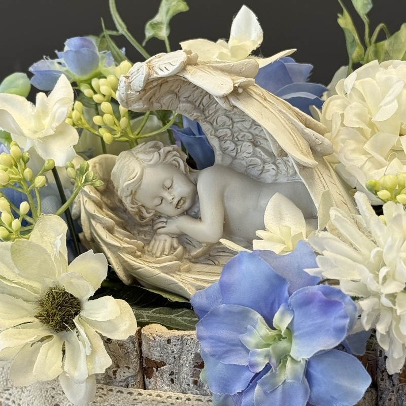 Śpiący aniołek otulony skrzydłami wyraża spokój, ukojenie i wieczny odpoczynek, a kwiatowa oprawa nadaje całości łagodności i delikatności. To niezwykła ozdoba nagrobna dla dziecka – pełna czułości, miłości i pamięci.