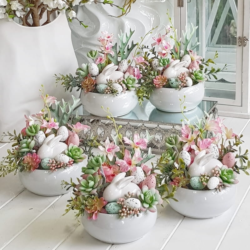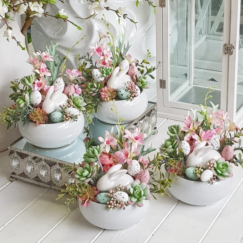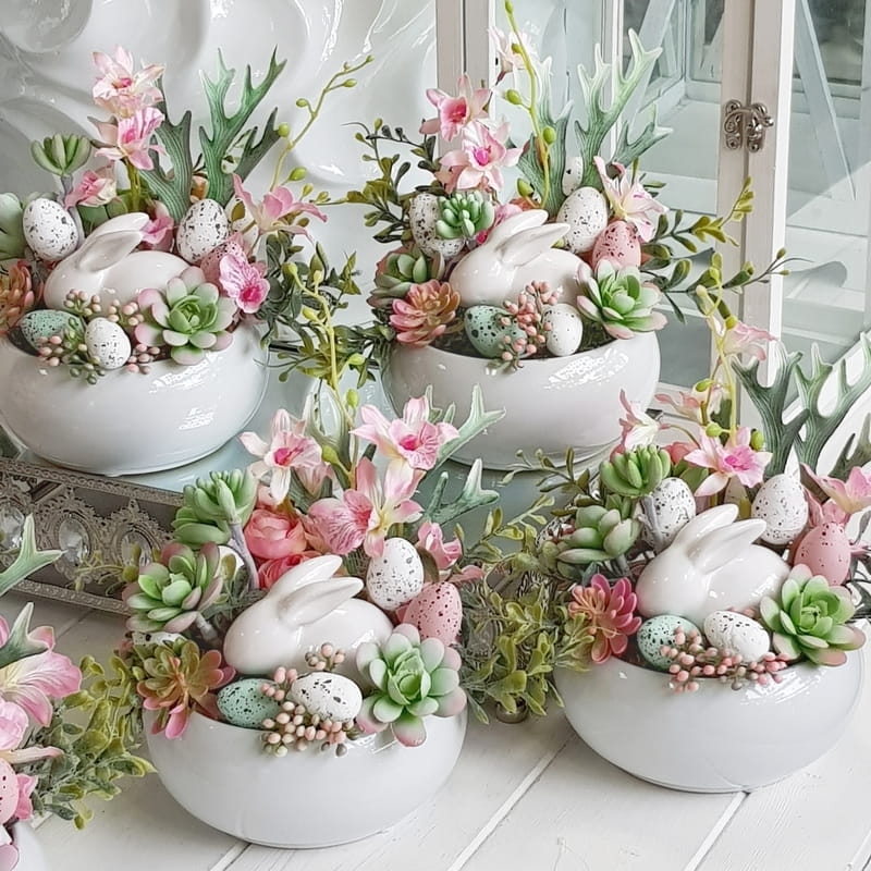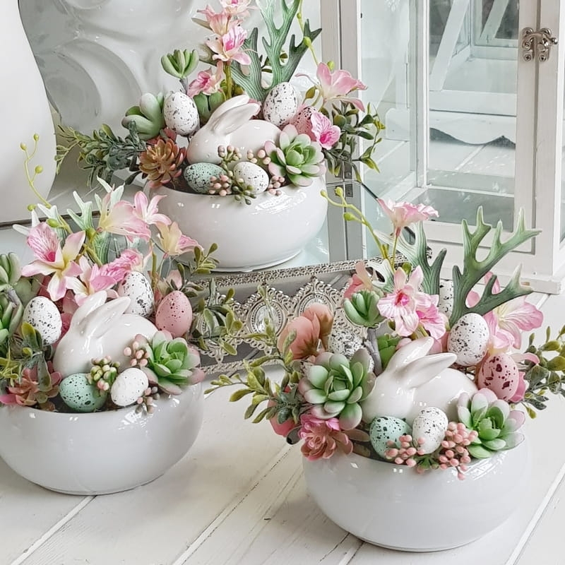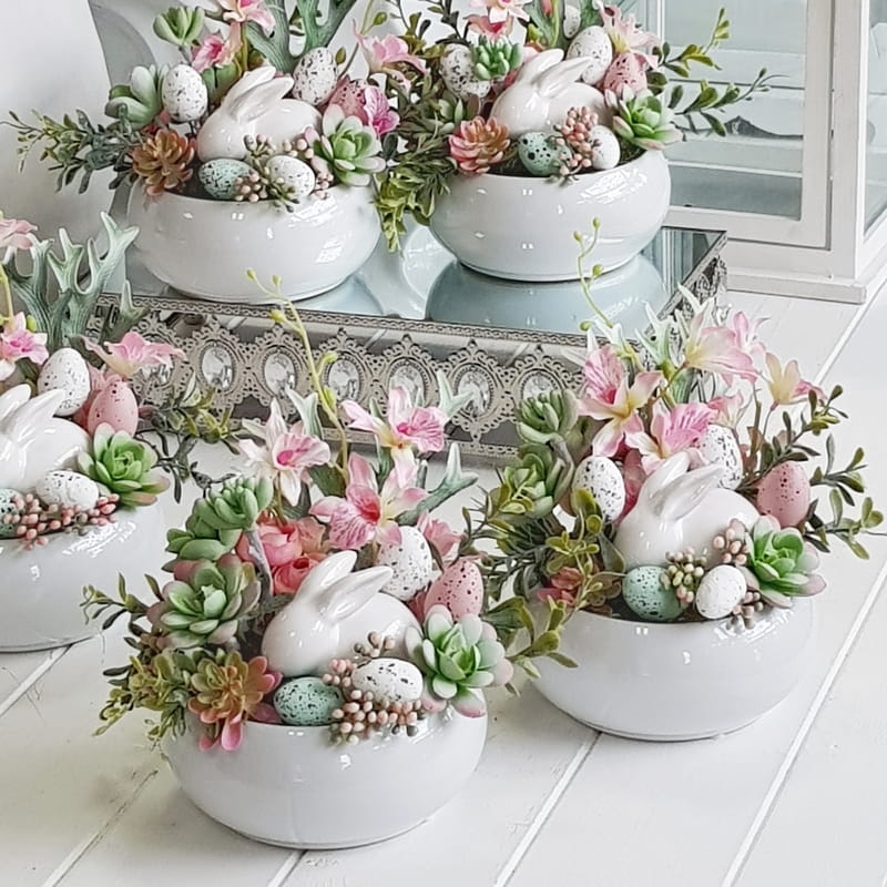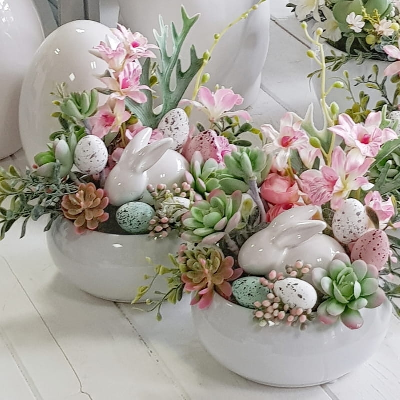 Kompozycja z zajączkiem osadzona w niskiej donicy typu misa. Dostały w niej wykorzystane sukulenty, wiosenne kwiaty i dodatki.