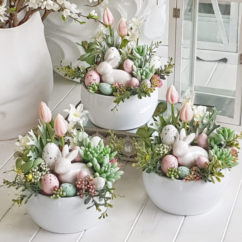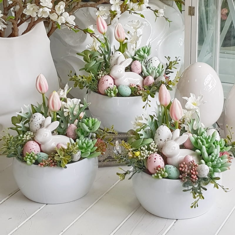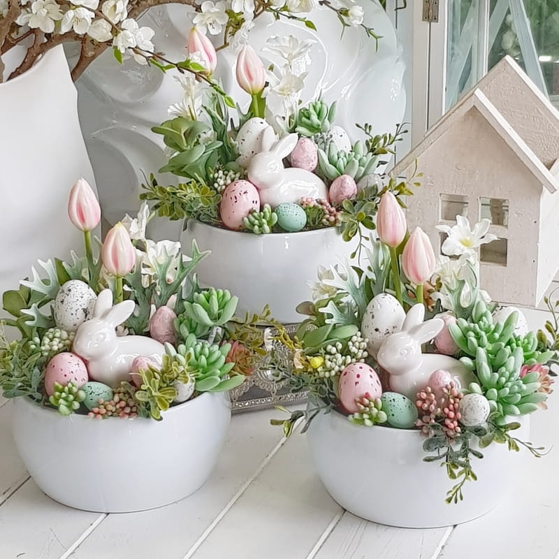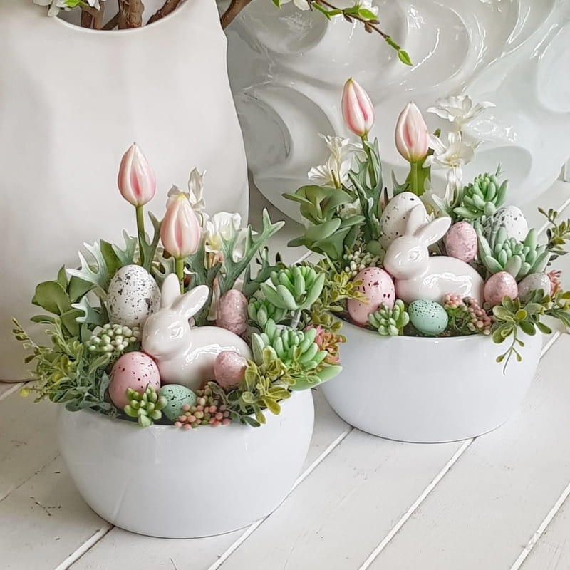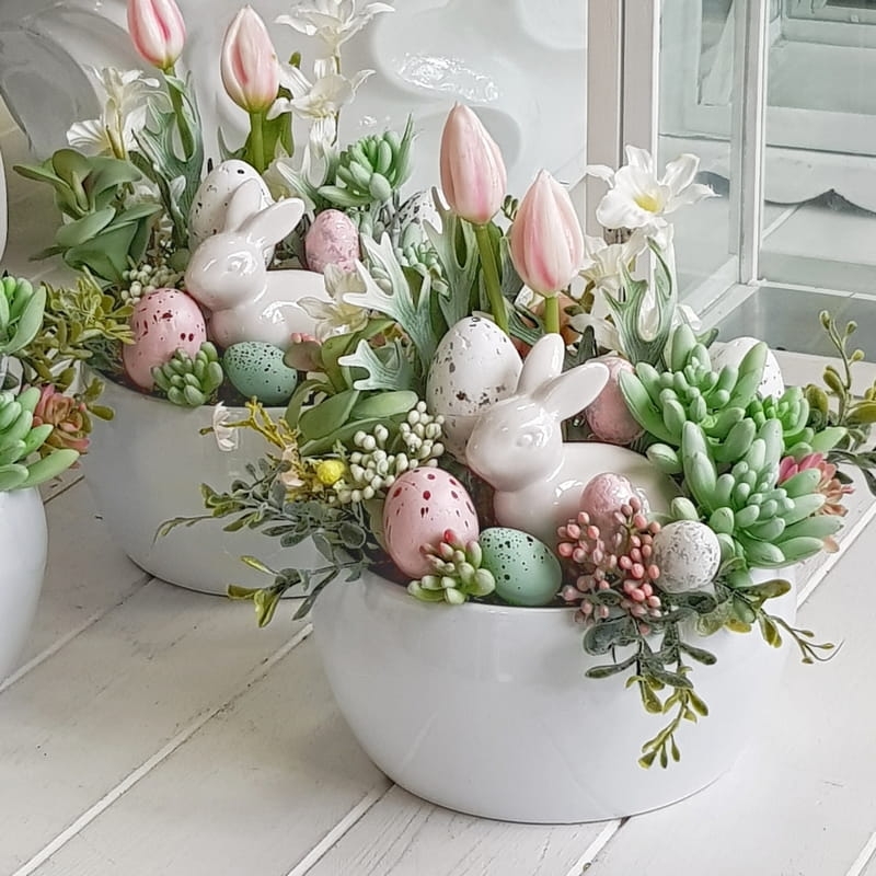 Kompozycja z zajączkiem osadzona w niskiej donicy typu misa. Dostały w niej wykorzystane sukulenty, wiosenne kwiaty i dodatki.
