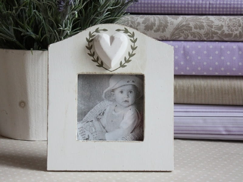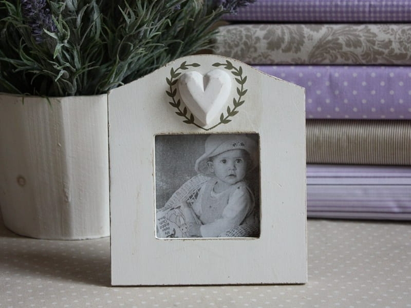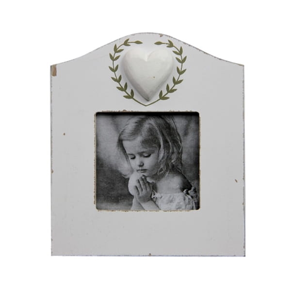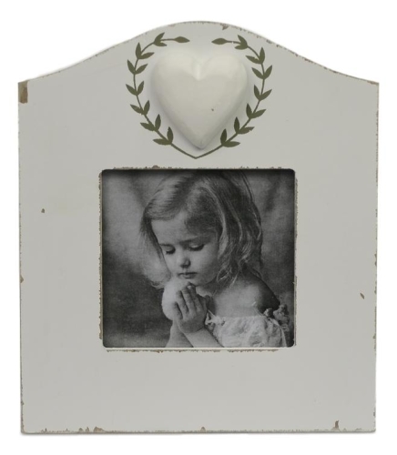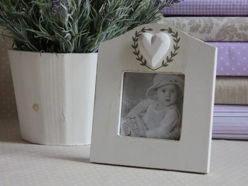 Stylowa, malowana na biało drewniana ramka z dekoracyjnym serduszkiem. Jest częścią kolekcji ramek, których elementem charakterystycznym jest serce otoczone dekoracyjnym wiankiem. Polecam jako dekoracyjny element każdego wnętrza w stylu prowansalskim. Dobry pomysł na prezent dla bliskiej osoby.