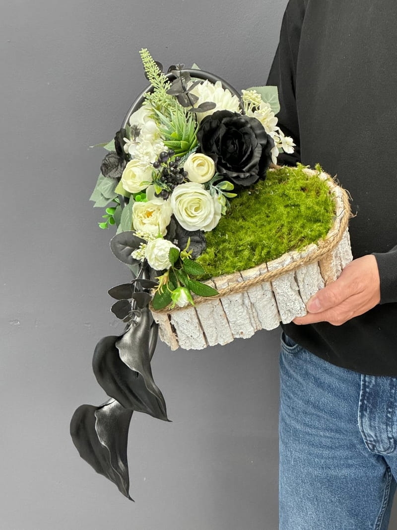 Dekoracja funeralna w postaci kwiatowego serca, gotowego do umieszczenia na płycie nagrobkowej. Postawa serca jest donica obłożona korą. Została dodatkowo obciążona cementem i wypełniona dużą ilością kwiatów w przepięknej, stonowanej kolorystyce. Szczególnego uroku dodają jej gumowe kalie uwydatniające i podkreślające kształt serca.