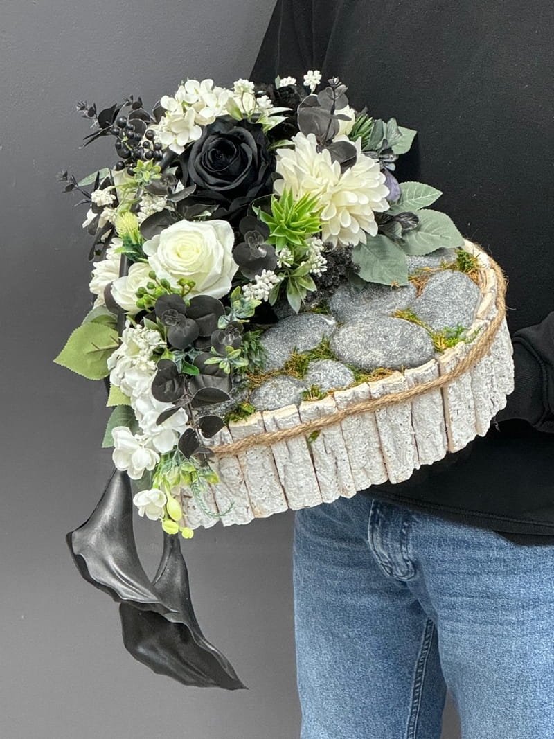 Piękna i oryginalna dekoracja jest doskonałą formą wyrażenia pamięci o bliskich. Oryginalna forma, najwyższej jakości kwiaty i perfekcyjne zestawienie kolorów sprawiają, że doskonale prezentuje się na nagrobkach.