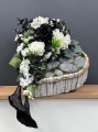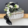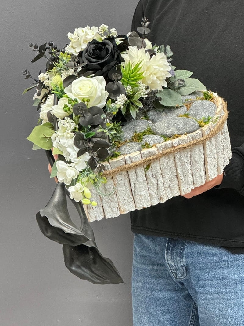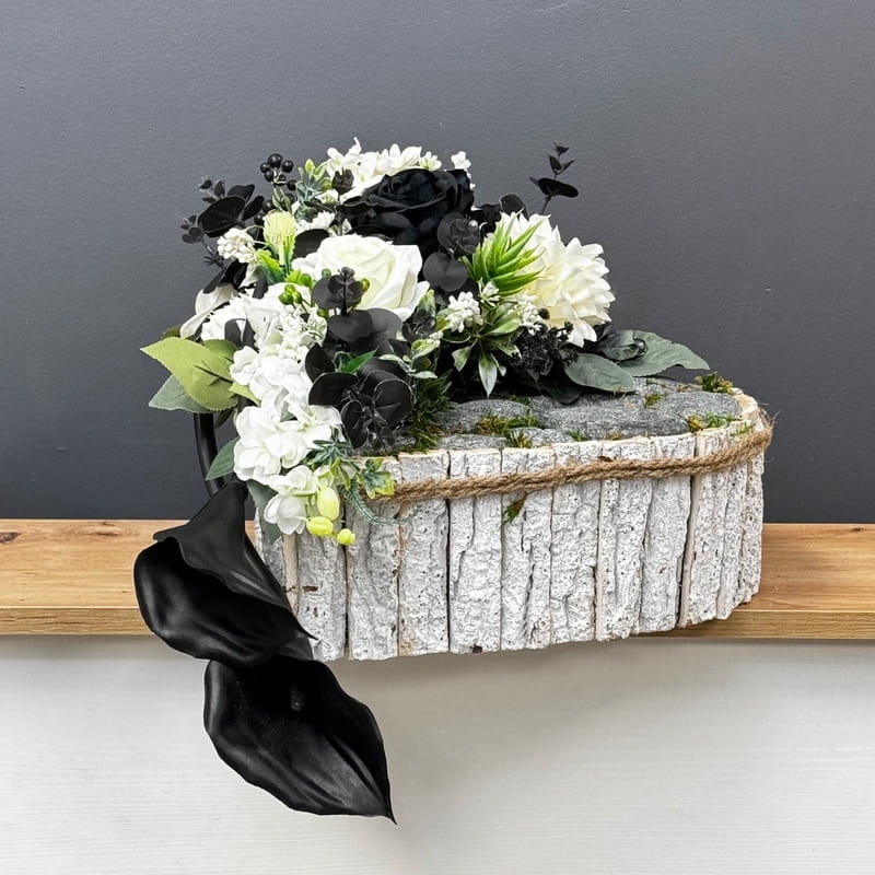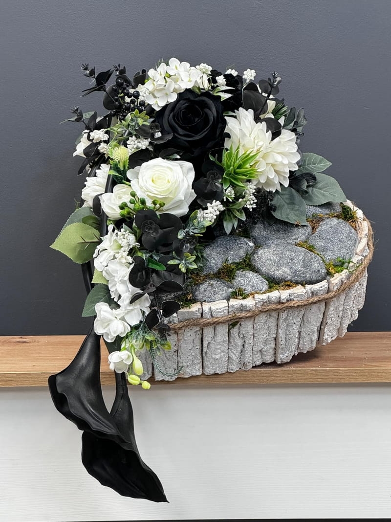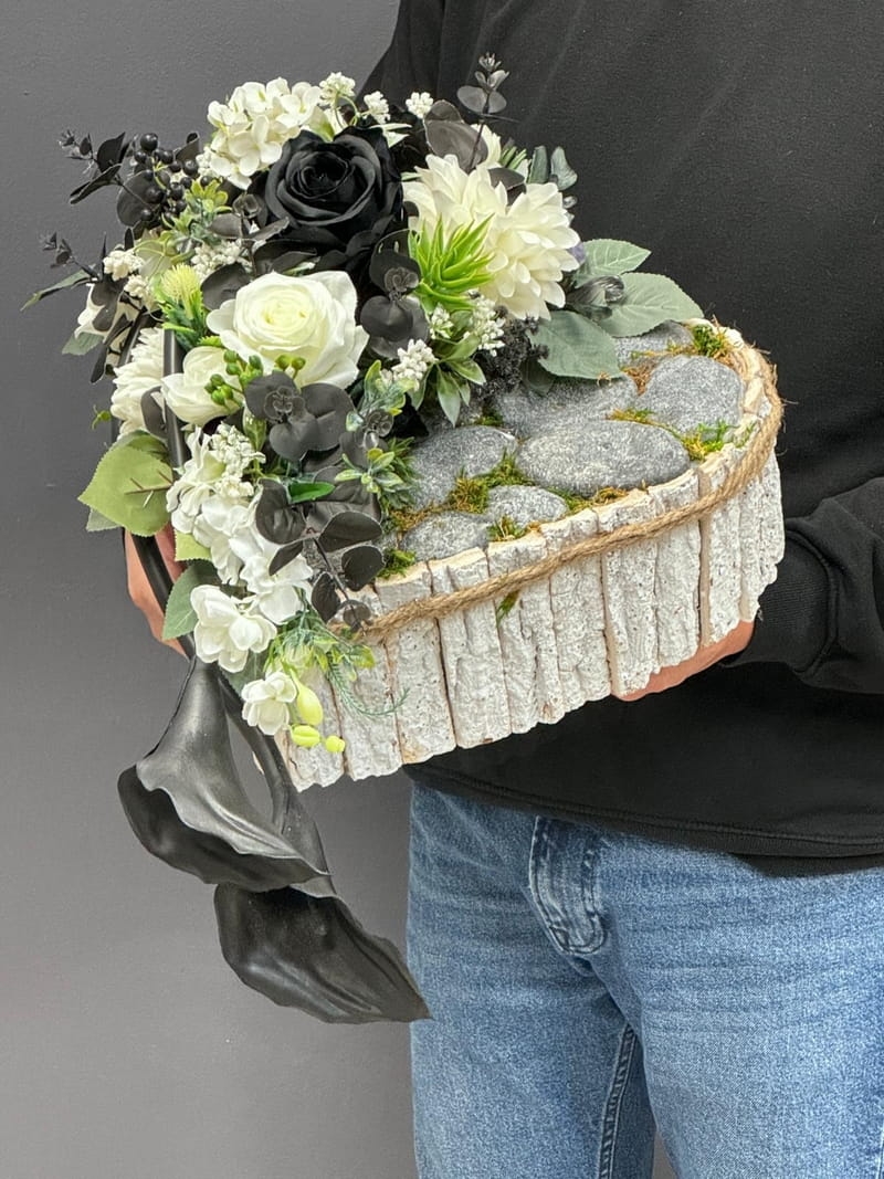 Dekoracja funeralna w postaci kwiatowego serca, gotowego do umieszczenia na płycie nagrobkowej. Postawa serca jest donica obłożona korą. Została dodatkowo obciążona cementem i wypełniona dużą ilością kwiatów w przepięknej, stonowanej kolorystyce. Szczególnego uroku dodają jej gumowe kalie uwydatniające i podkreślające kształt serca.