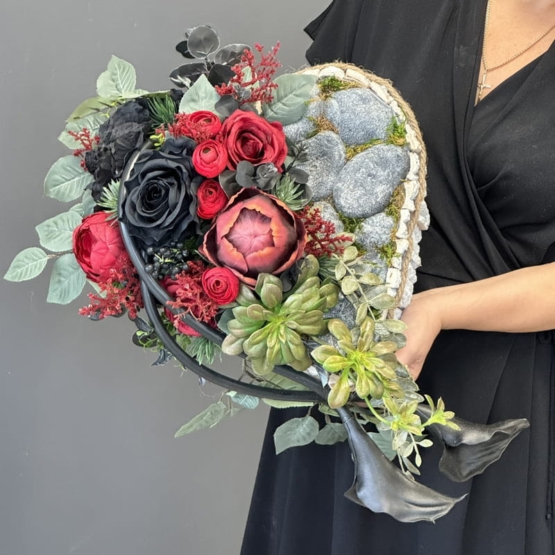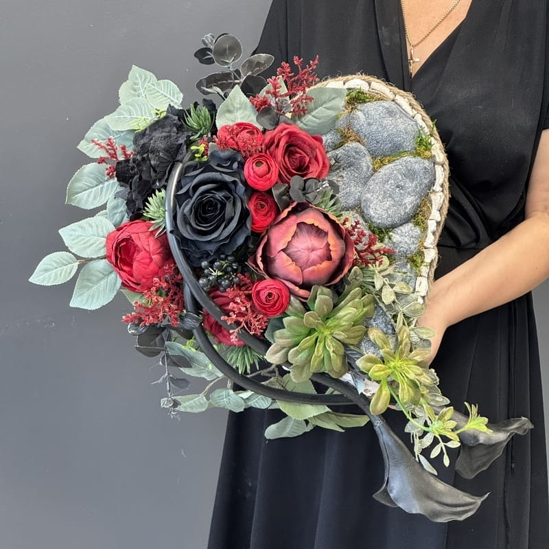Dekoracja funeralna w postaci kwiatowego serca, gotowego do umieszczenia na płycie nagrobkowej. Postawa serca jest donica obłożona korą. Została dodatkowo obciążona cementem i wypełniona dużą ilością kwiatów w przepięknej, stonowanej kolorystyce. Szczególnego uroku dodają jej gumowe kalie uwydatniające i podkreślające kształt serca.