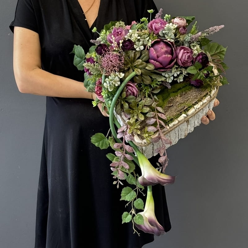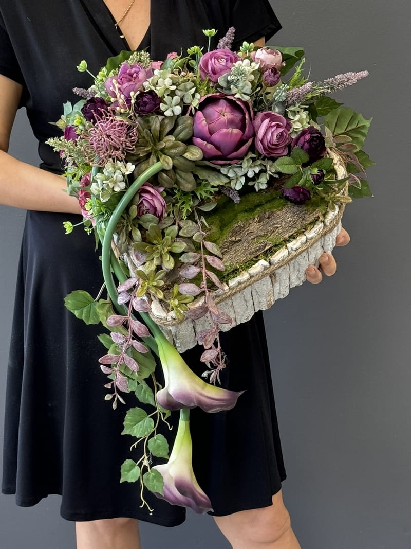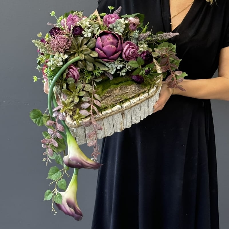 Dekoracja funeralna w postaci kwiatowego serca, gotowego do umieszczenia na płycie nagrobkowej. Postawa serca jest donica obłożona korą. Została dodatkowo obciążona cementem i wypełniona dużą ilością kwiatów w przepięknej, stonowanej kolorystyce. Szczególnego uroku dodają jej gumowe kalie uwydatniające i podkreślające kształt serca.