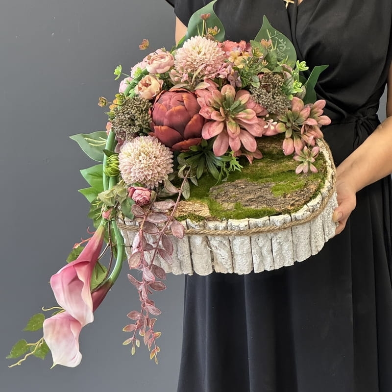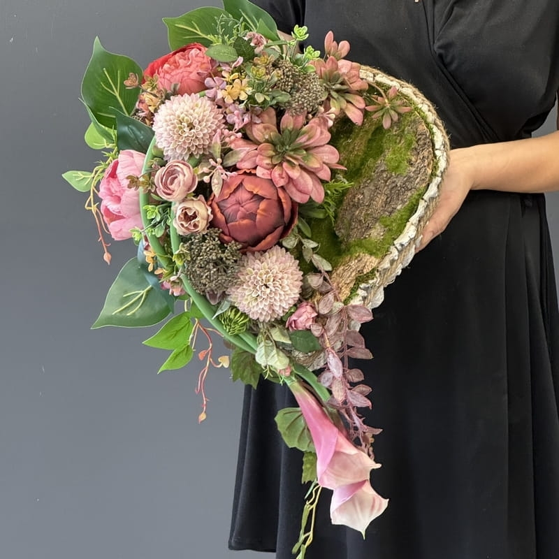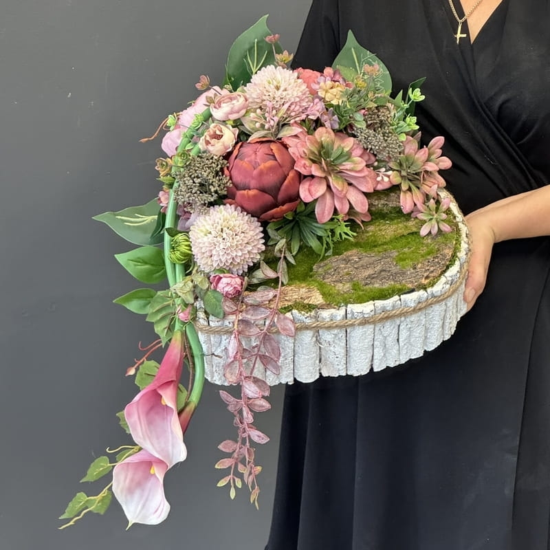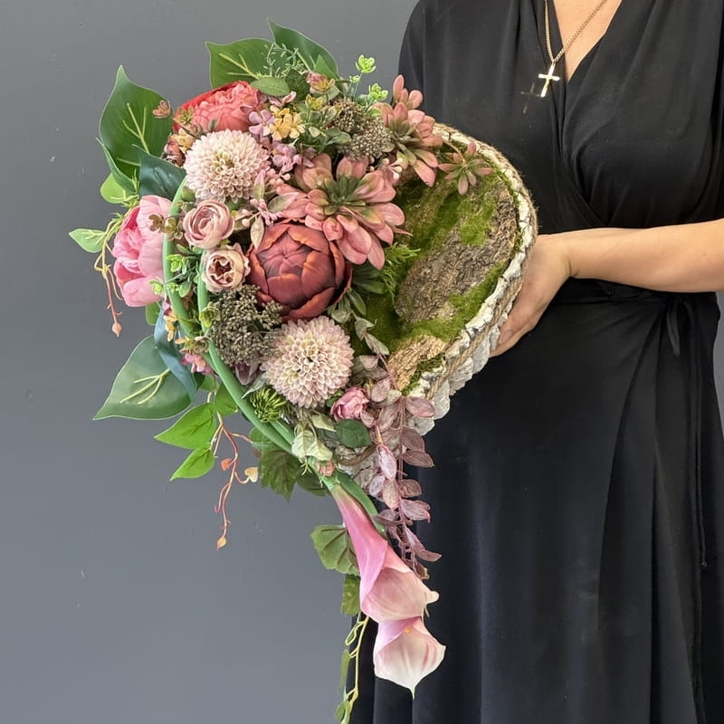 Dekoracja funeralna w postaci kwiatowego serca, gotowego do umieszczenia na płycie nagrobkowej. Postawa serca jest donica obłożona korą. Została dodatkowo obciążona cementem i wypełniona dużą ilością kwiatów w przepięknej, stonowanej kolorystyce. Szczególnego uroku dodają jej gumowe kalie uwydatniające i podkreślające kształt serca.