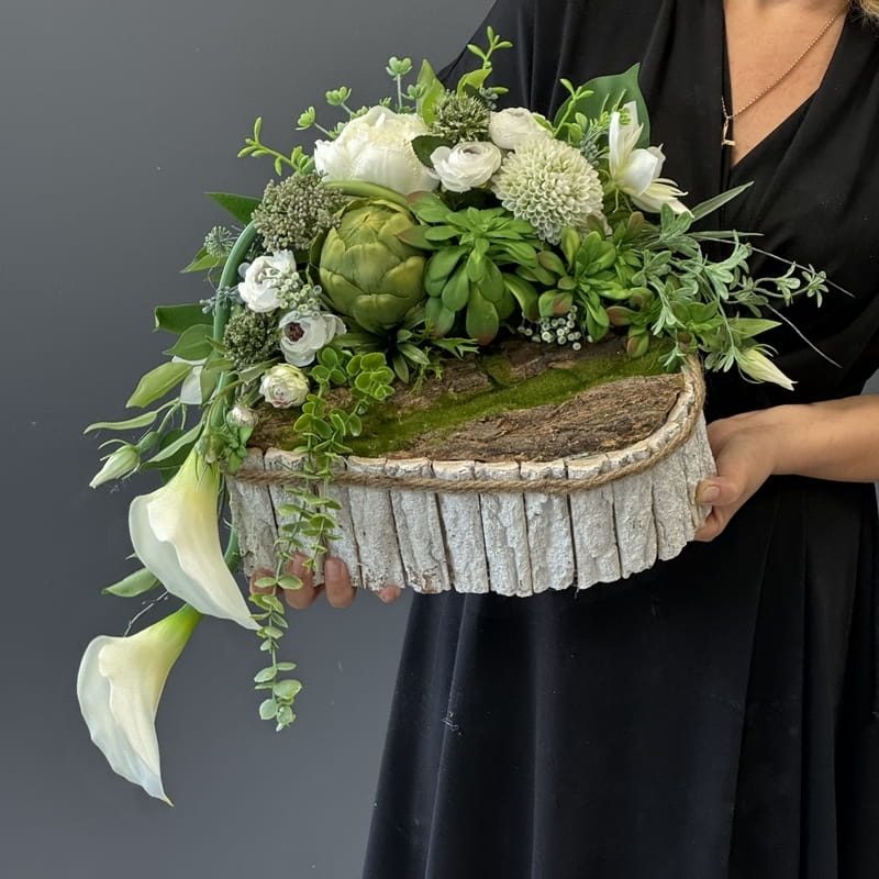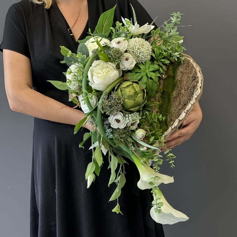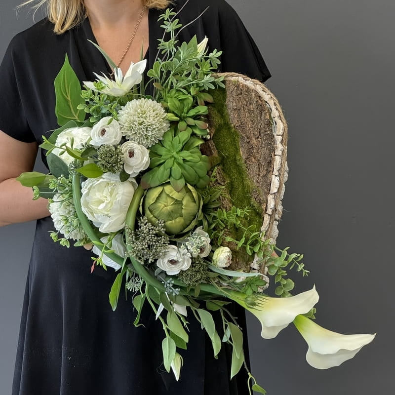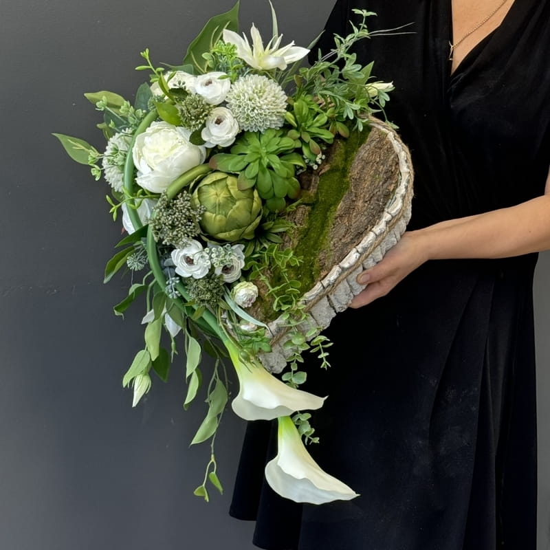 Dekoracja funeralna w postaci kwiatowego serca, gotowego do umieszczenia na płycie nagrobkowej. Postawa serca jest donica obłożona korą. Została dodatkowo obciążona cementem i wypełniona dużą ilością kwiatów w przepięknej, stonowanej kolorystyce. Szczególnego uroku dodają jej gumowe kalie uwydatniające i podkreślające kształt serca.