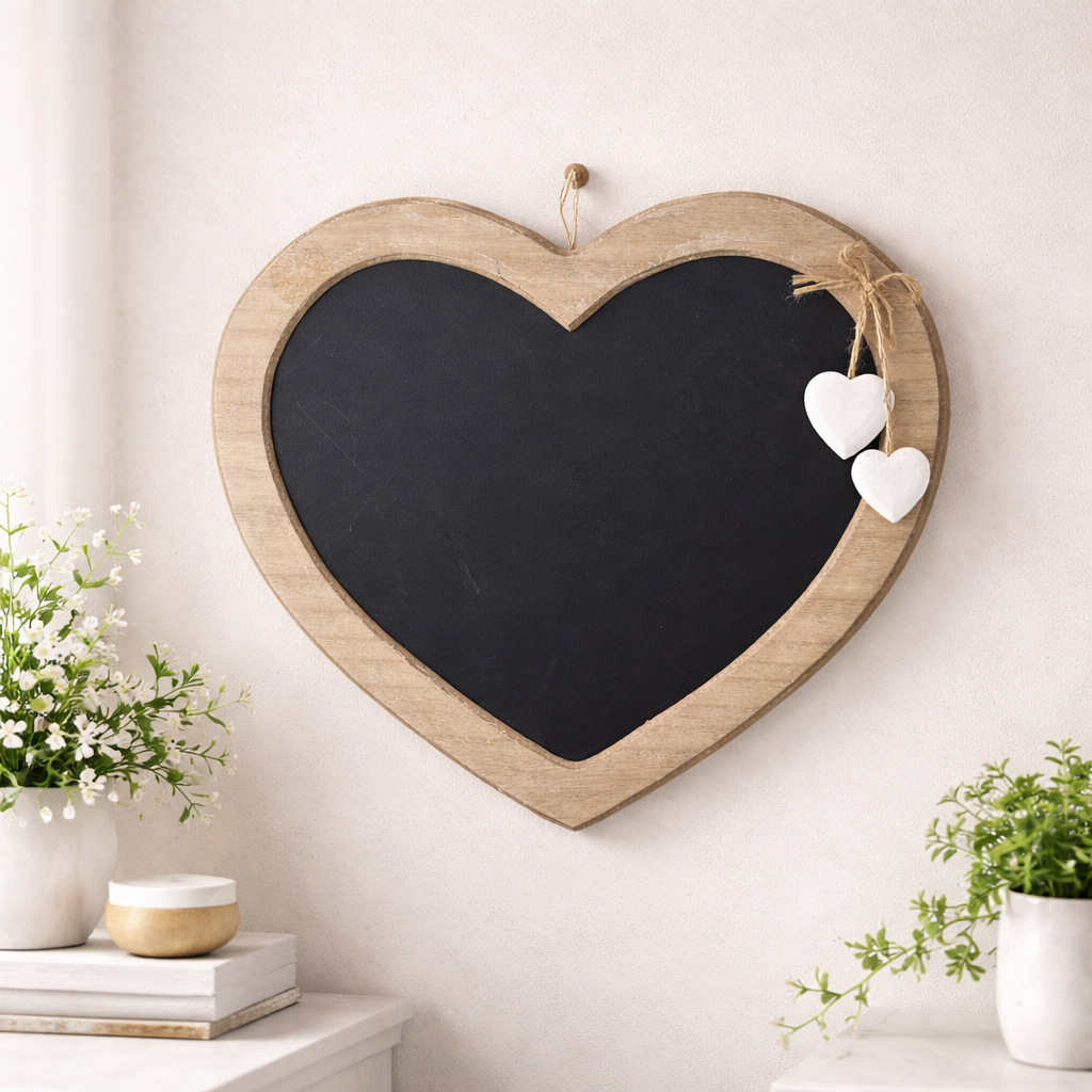 Oryginalna tablica do zapisków kredą w kształcie serca. Ważne wiadomości zyskają stylową oprawę. Tablica jest ozdobiona niewielkim, uroczymi drewnianymi serduszkami oraz sznurkiem w roli zawieszki. Może również pełnić funkcję ramki. Ponieważ wewnętrzna część tablicy jest wyjmowalna, wystarczy włożyć własne zdjęcie lub plakat. Ładnie będzie się prezentowała w kuchni, jadalni czy przedpokoju. Dobry pomysł na niebanalny prezent.