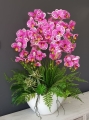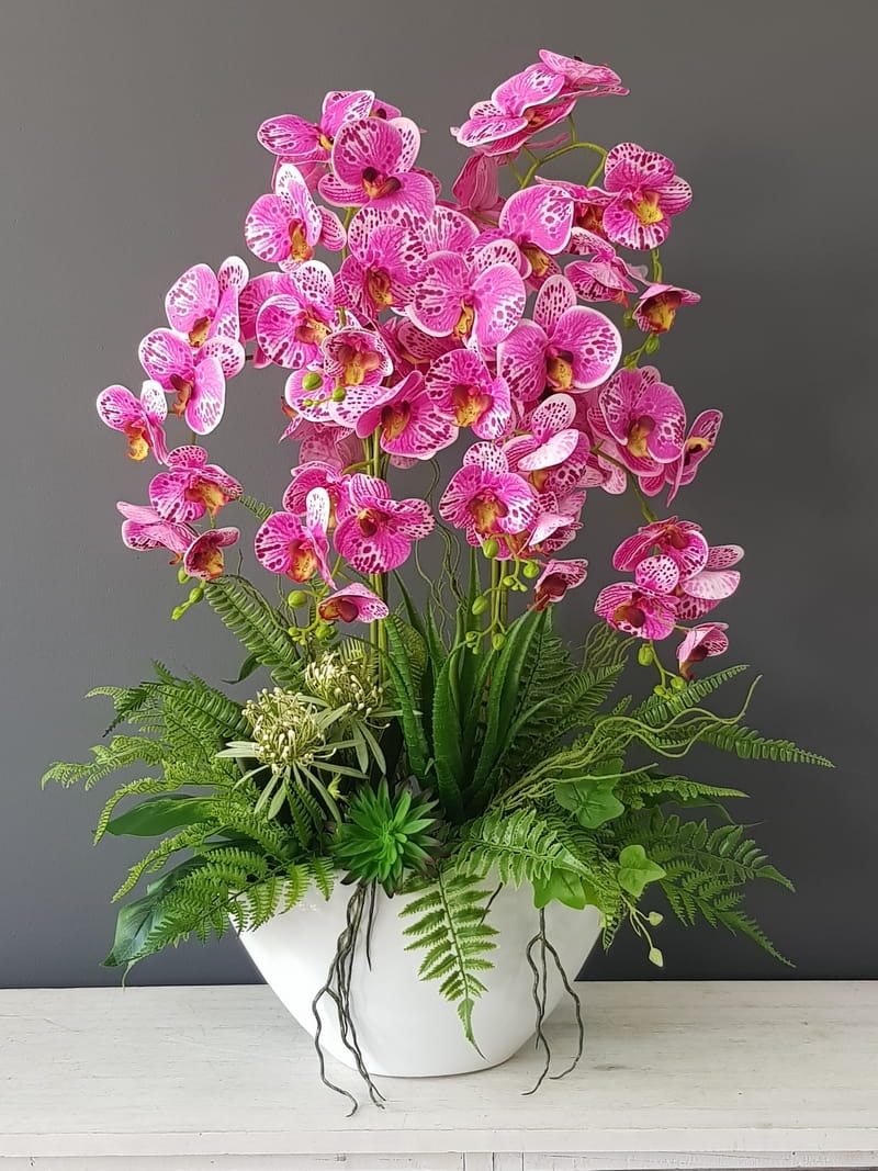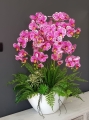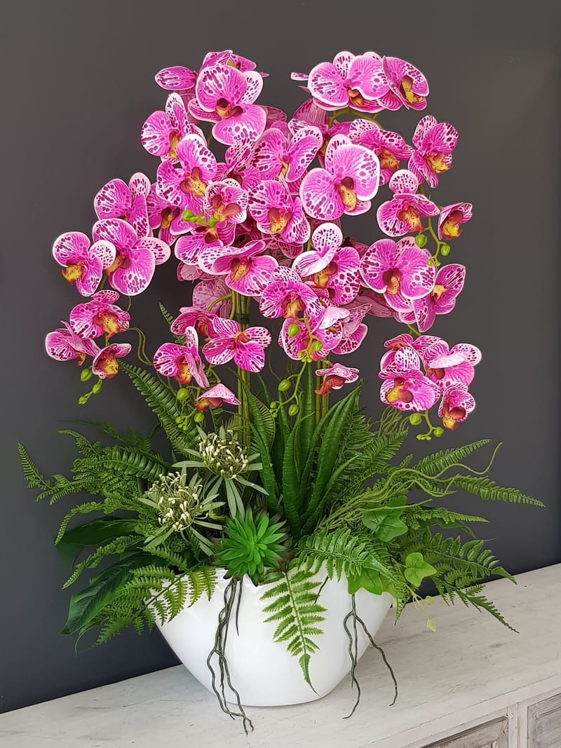 Oryginalna kompozycja z gumowanych storczyków oraz wysokiej jakości roślin sztucznych oraz ceramiki. Płatki kwiatów orchidei są nieco sztywniejsze niż w przypadku silikonowych storczyków, jednak prezentują się równie dobrze. Storczyk w dużej donicy idealnie sprawdzi się jako ozdoba mieszkań zarówno w stylu klasycznym oraz nowoczesnym. Pięknie będzie się prezentowała na komodzie czy dużym parapecie. Polecamy jako oryginalny pomysł na prezent.