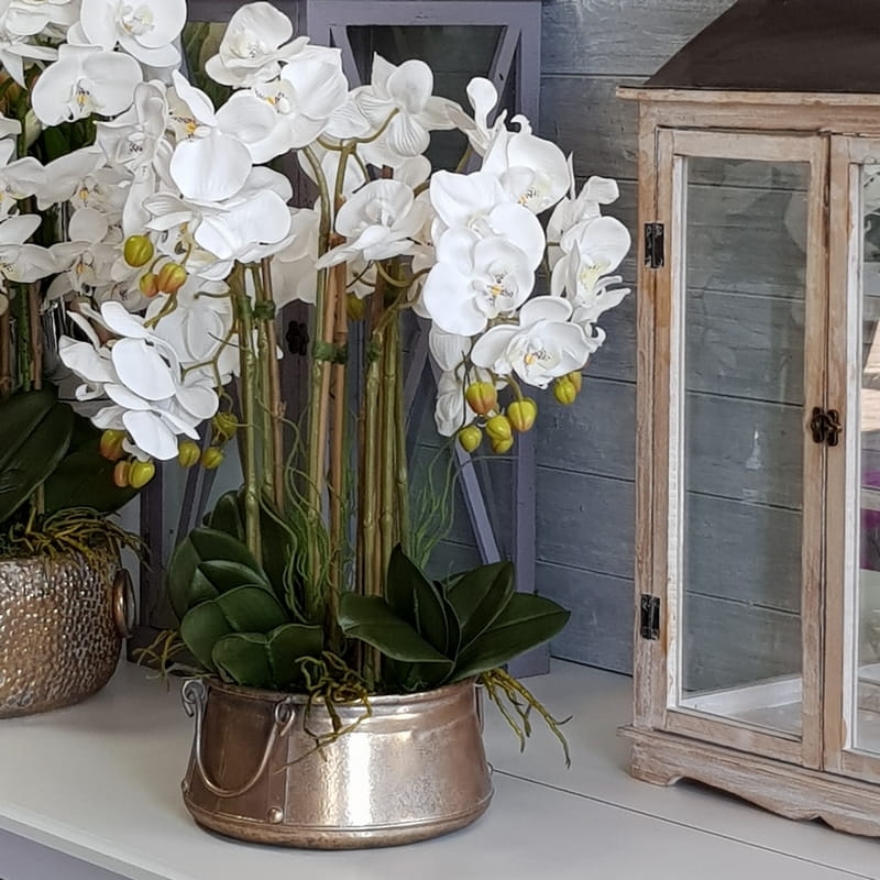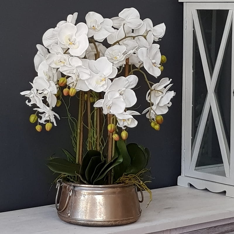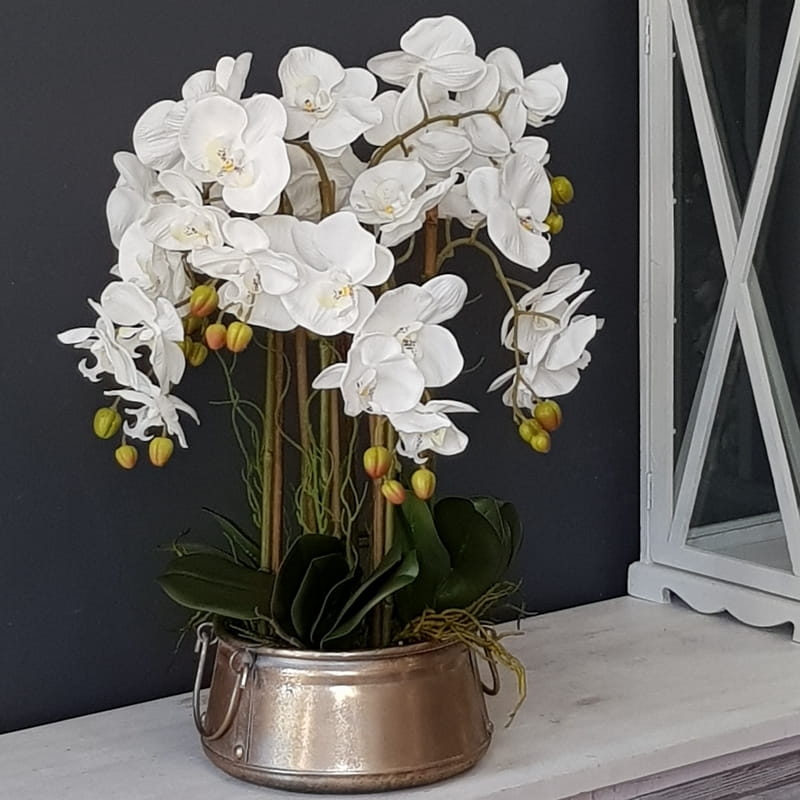 Urocza kompozycja kwiatowa wykonana z silikonowych storczyków najwyższej jakości, liści i metalowej donicy. Rewelacyjny dodatek niemal do każdego wnętrza. Dobrze będzie się prezentowała zarówno w przestrzeni mieszkalnej, jak i biurowej, a także w restauracji, gabinecie, salonie kosmetycznym czy sali weselnej. Storczyki z firmy Dekomotyw to trwała dekoracja na długie lata. Donicę należy czyścić wyłącznie na sucho.