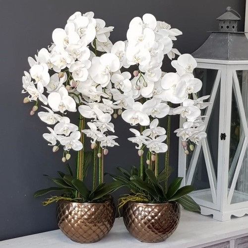 Urocza kompozycja kwiatowa wykonana z silikonowych storczyków najwyższej jakości, liści i ceramicznej donicy. Rewelacyjny dodatek niemal do każdego wnętrza. Dobrze będzie się prezentowała zarówno w przestrzeni mieszkalnej, jak i biurowej, a także w restauracji, gabinecie, salonie kosmetycznym czy sali weselnej. Storczyki z firmy Dekomotyw to trwała dekoracja na długie lata. Donicę należy czyścić wyłącznie na sucho.