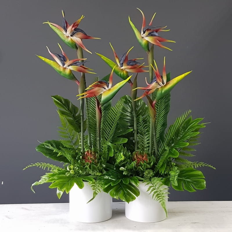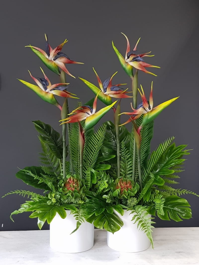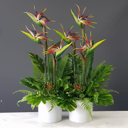 Oryginalna kompozycja roślinna, wykonana z wysokiej jakości gumowanych kwiatów strelicji, egzotycznych, woskowanych liści oraz ceramicznej donicy. Idealnie sprawdzi się jako ozdoba mieszkań zarówno w stylu klasycznym, jak i nowoczesnym. Pięknie będzie się prezentowała na komodzie czy podłodze. Polecamy jako oryginalny pomysł na prezent.