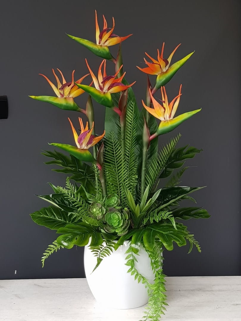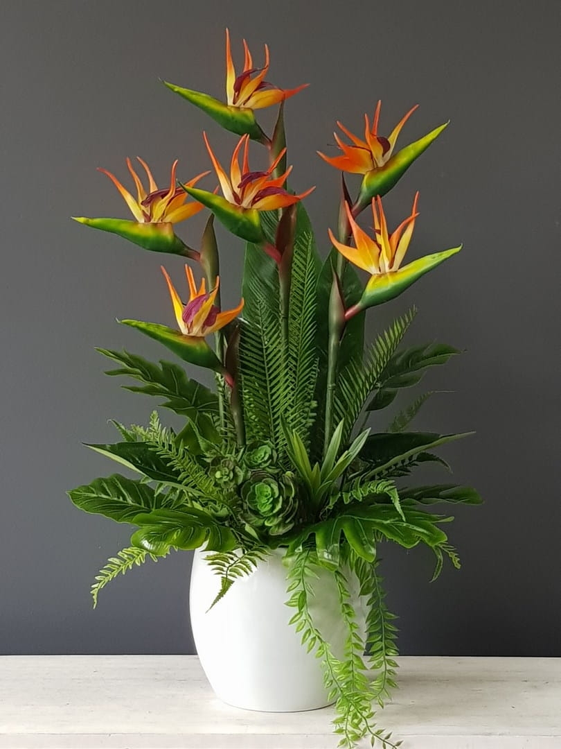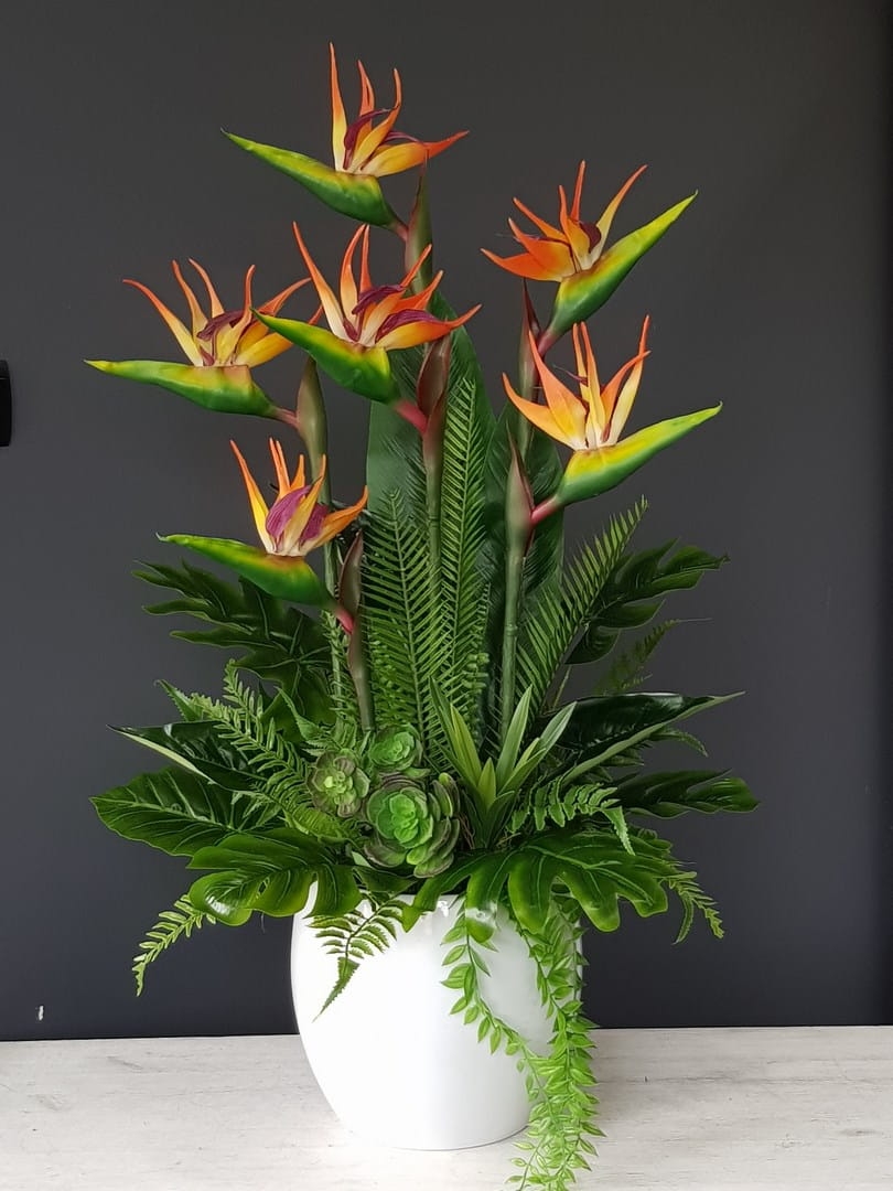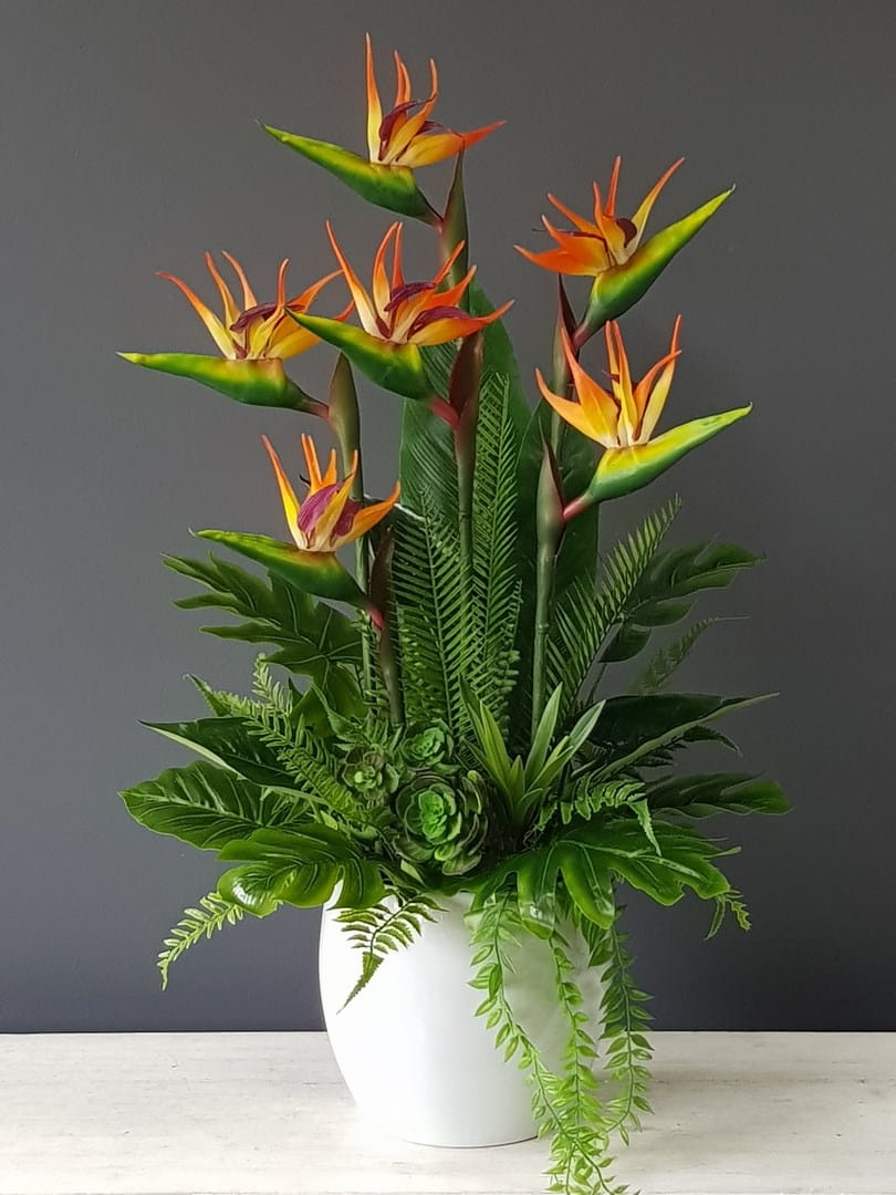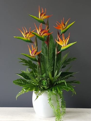 Oryginalna kompozycja roślinna, wykonana z wysokiej jakości gumowanych kwiatów strelicji, egzotycznych, woskowanych liści oraz ceramicznej donicy. Idealnie sprawdzi się jako ozdoba mieszkań zarówno w stylu klasycznym, jak i nowoczesnym. Pięknie będzie się prezentowała na komodzie czy podłodze. Polecamy jako oryginalny pomysł na prezent.