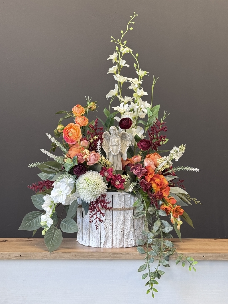 Subtelna i nowoczesna kompozycja nagrobna z delikatną figurką anioła, osadzona w solidnej, obciążonej donicy pokrytej naturalną korą i ozdobionej rustykalnym, naturalnym sznurkiem. Aranżacja utrzymana jest w stonowanej, eleganckiej kolorystyce, w której dominują delikatne odcienie letnich kwiatów. Kompozycję uzupełniają miękkie akcenty pudrowej zieleni liści, a także starannie dobrane kwiaty, np.: róże, peonie, eustoma, storczyk tajlandzki, camelki oraz gałązki wrzosu, które nadają całości lekkości i wyjątkowego charakteru.