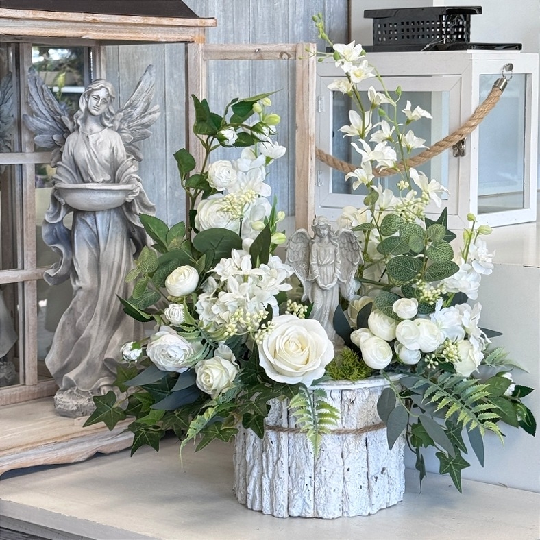 Subtelna i nowoczesna kompozycja nagrobna z delikatną figurką anioła, osadzona w solidnej, obciążonej donicy pokrytej naturalną korą i ozdobionej rustykalnym, naturalnym sznurkiem. Aranżacja utrzymana jest w stonowanej, eleganckiej kolorystyce, w której dominują delikatne odcienie letnich kwiatów. Kompozycję uzupełniają miękkie akcenty pudrowej zieleni liści, a także starannie dobrane kwiaty, np.: róże, peonie, eustoma, storczyk tajlandzki, camelki oraz gałązki wrzosu, które nadają całości lekkości i wyjątkowego charakteru.