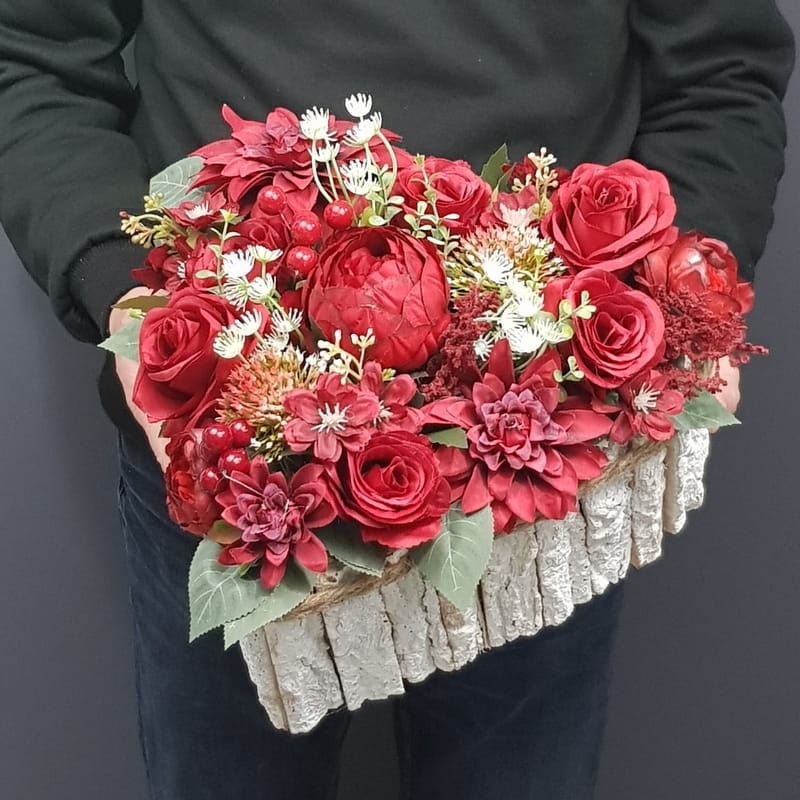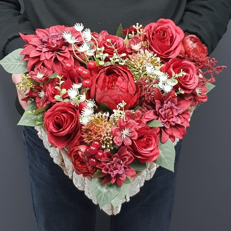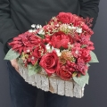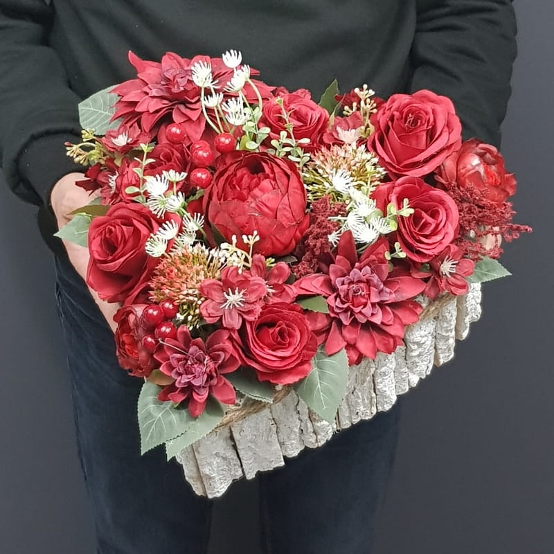 Oryginalna kompozycja nagrobna osadzona w drewnianej donicy w kształcie serca. Postawa jest obciążona cementem. Została wypełniona dużą ilością średnich i drobnych kwiatów i dodatków w przepięknej, stonowanej kolorystyce.