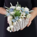 Niewielka, ale bardzo dekoracyjna kompozycja nagrobna osadzona w drewnianej donicy w kształcie serca. Postawa jest obciążona cementem. Została wypełniona dużą ilością drobnych kwiatów i dodatków w przepięknej, stonowanej kolorystyce.