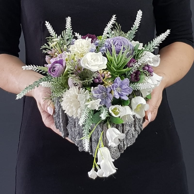 Niewielka, ale bardzo dekoracyjna kompozycja nagrobna osadzona w drewnianej donicy w kształcie serca. Postawa jest obciążona cementem. Została wypełniona dużą ilością drobnych kwiatów i dodatków w przepięknej, stonowanej kolorystyce. Idealna do położenia na dziecięcym nagrobku lub w kolumbarium.