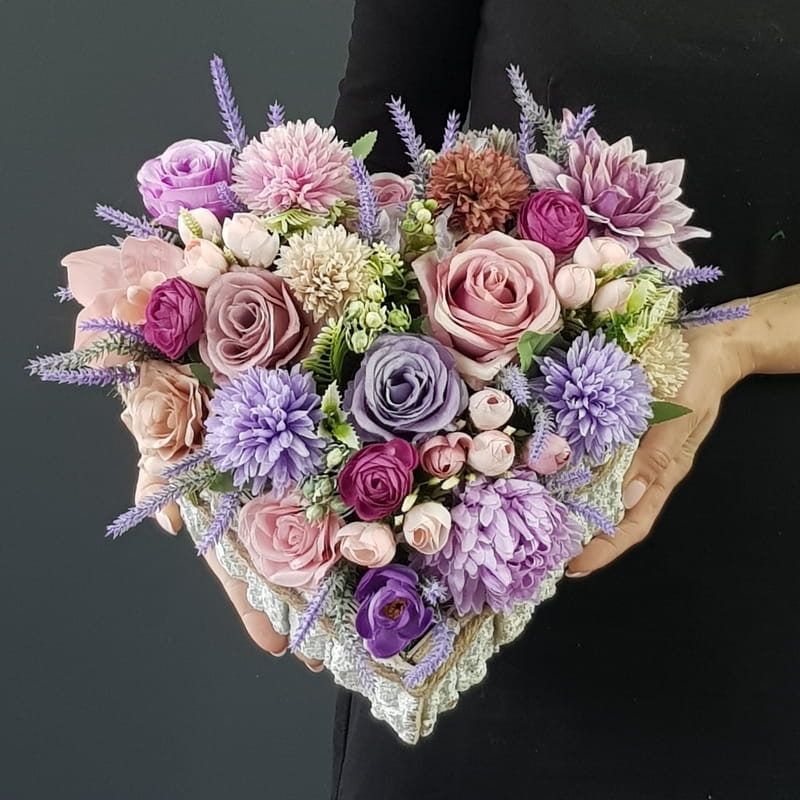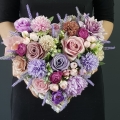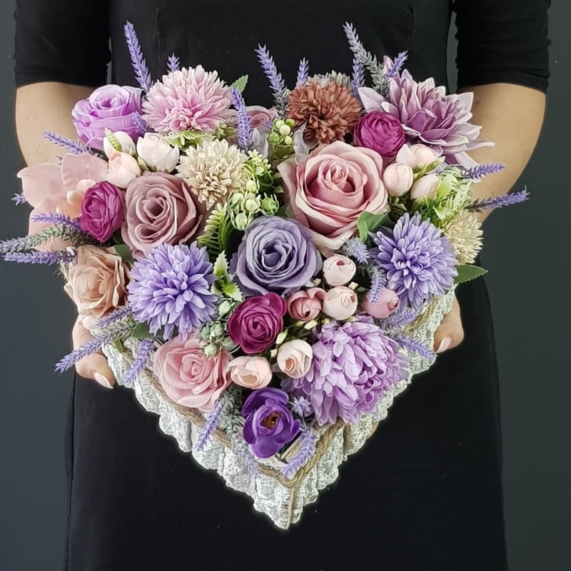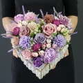 Oryginalna kompozycja nagrobna osadzona w drewnianej donicy w kształcie serca. Postawa jest obciążona cementem. Została wypełniona dużą ilością średnich i drobnych kwiatów i dodatków w przepięknej, stonowanej kolorystyce.