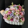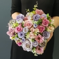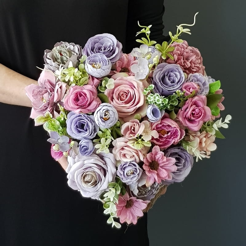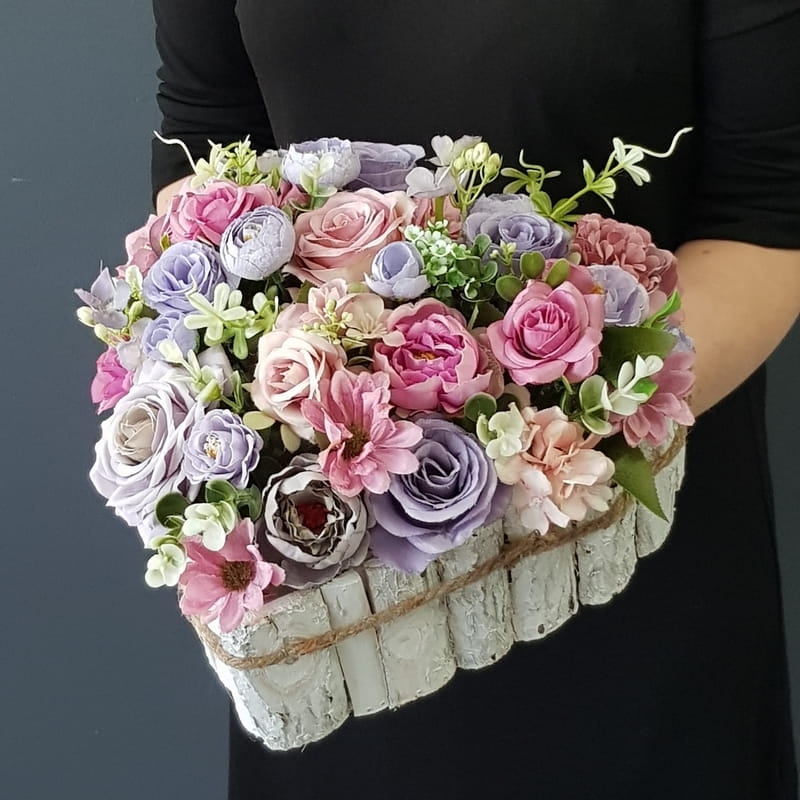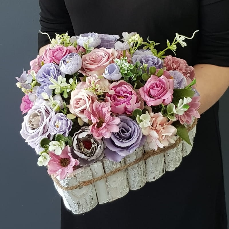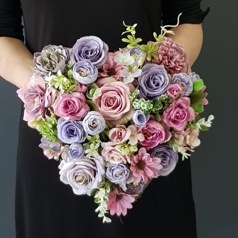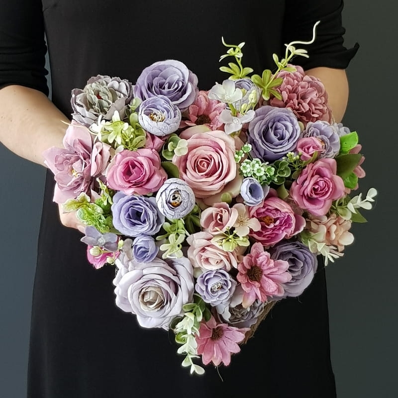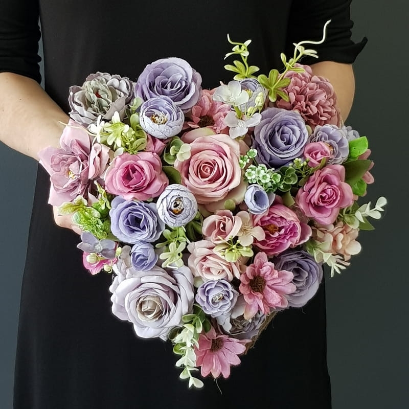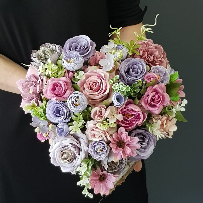 Kwiatowa kompozycja nagrobna osadzona w drewnianej donicy w kształcie serca. Postawa jest obciążona cementem. Została wypełniona dużą ilością drobnych kwiatów i dodatków w przepięknej, stonowanej kolorystyce.