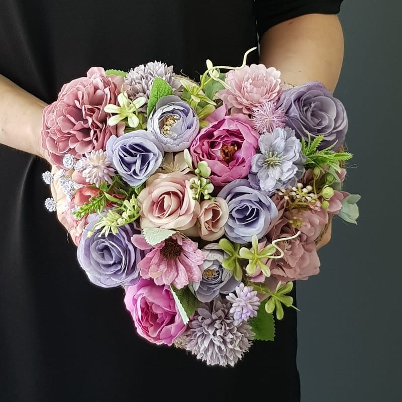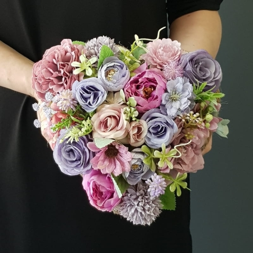 Niewielka, ale bardzo dekoracyjna kompozycja nagrobna osadzona w drewnianej donicy w kształcie serca. Postawa jest obciążona cementem. Została wypełniona dużą ilością drobnych kwiatów i dodatków w przepięknej, stonowanej kolorystyce.