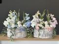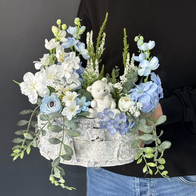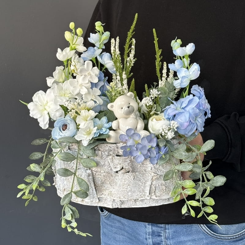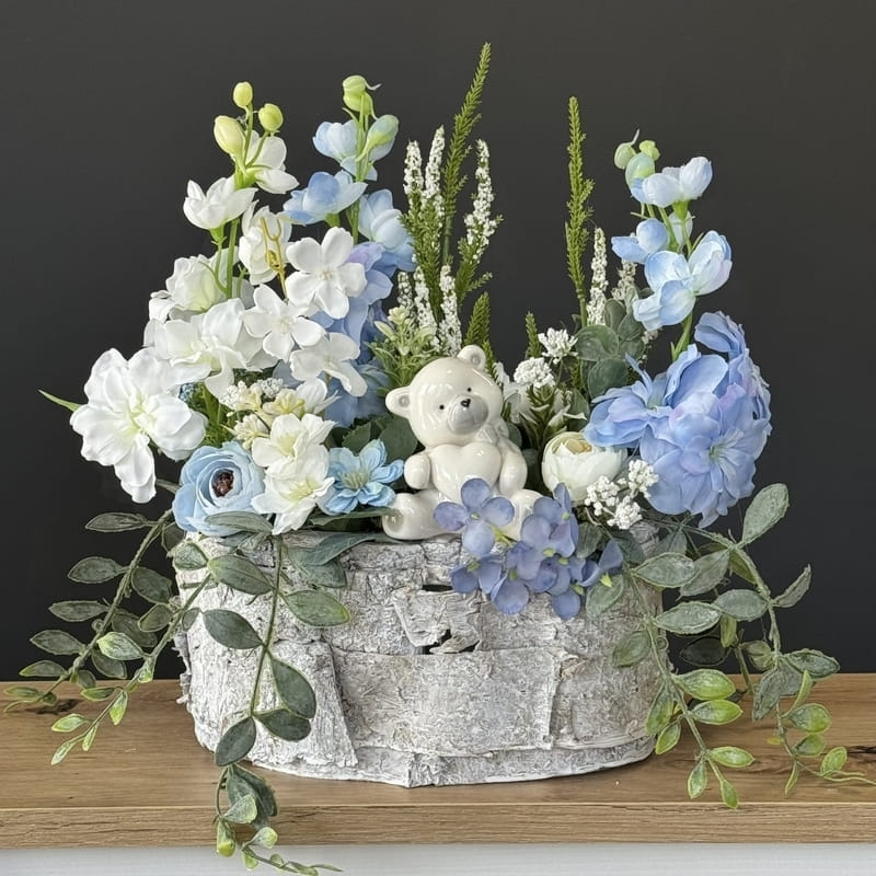 Dekoracja funeralna w postaci kompozycji w drewnianej donicy gotowej do umieszczenia na płycie nagrobkowej lub w kolumbarium. Kompozycja stworzona z kwiatów i dodatków w pastelowych kolorach kolorach została uzupełniona figurka ceramicznego misia umieszczoną w centralnym punkcie.
