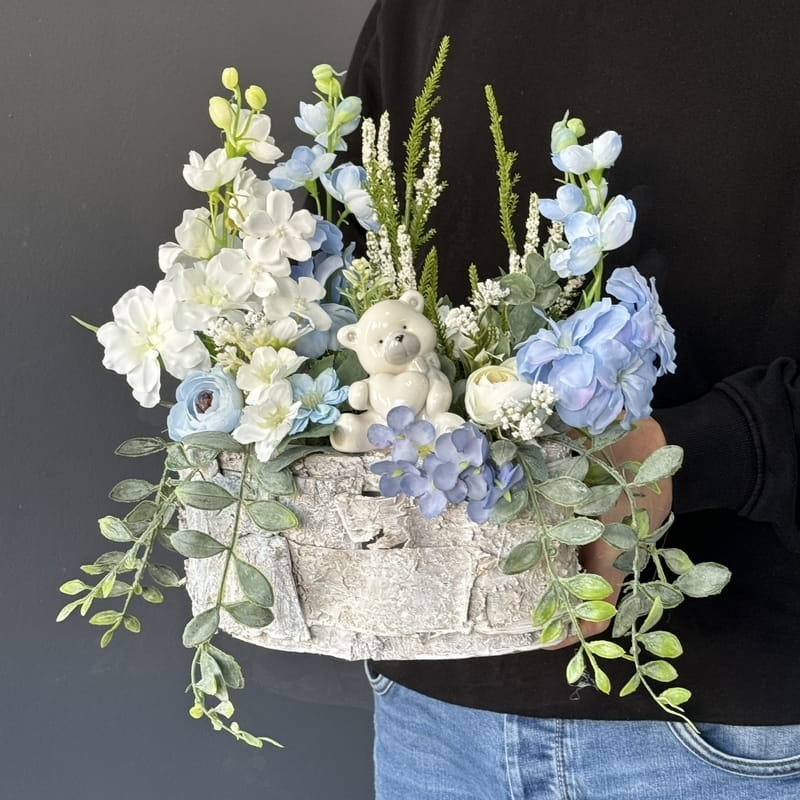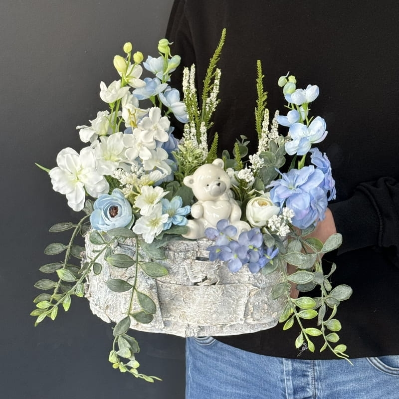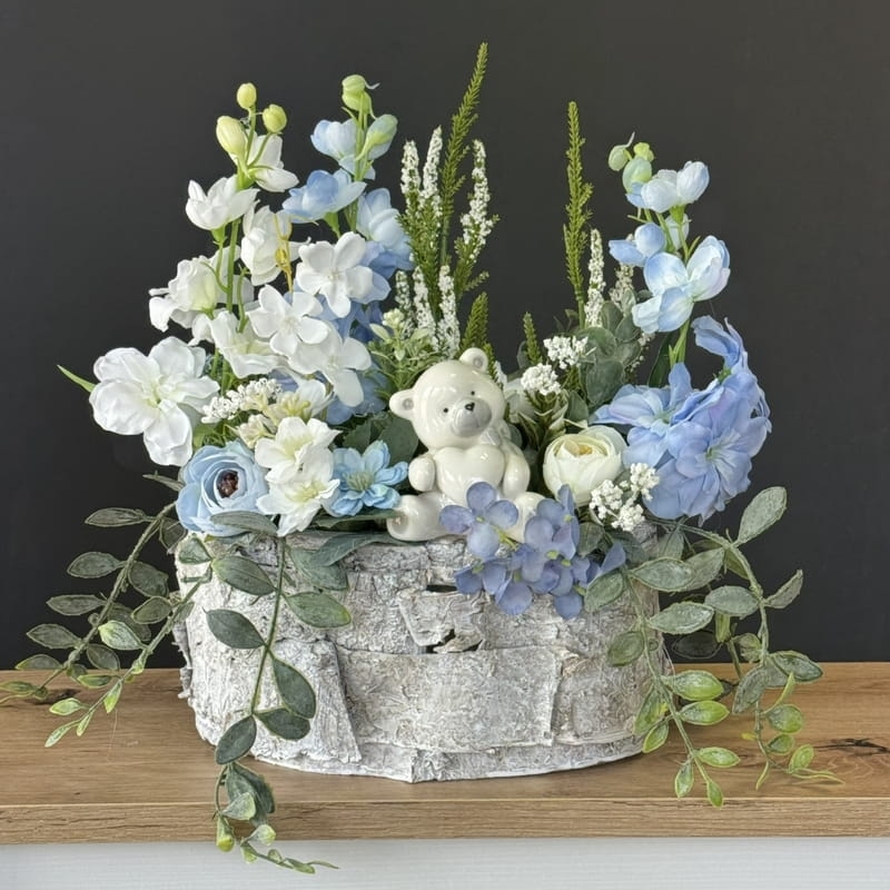 Stroik na grób z misiem kompozycja funeralna nagrobna Noe niebieska