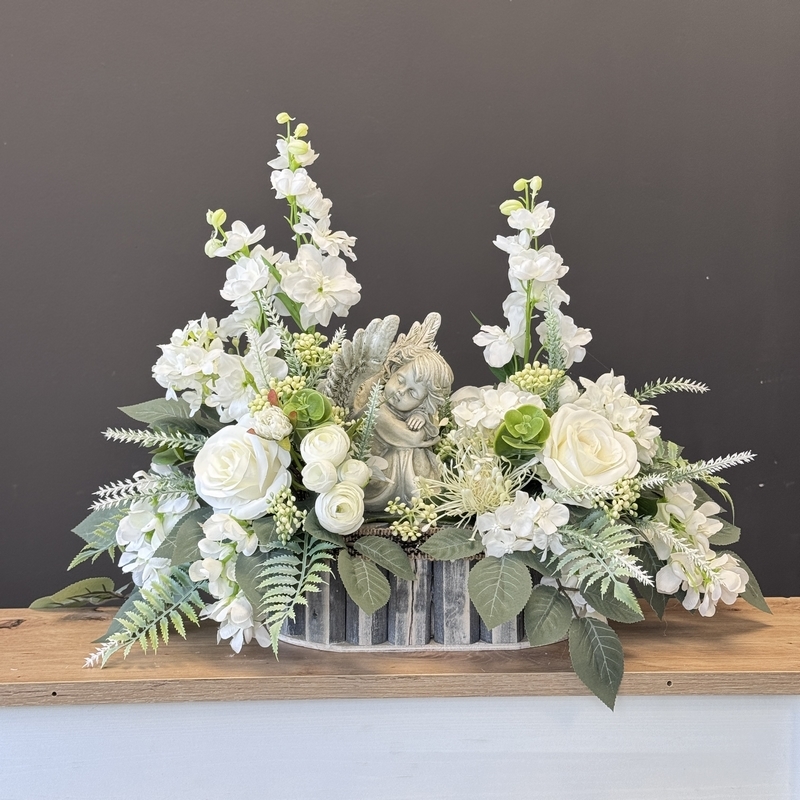 Stroik nagrobny „Wieczna tęsknota” elegancka kompozycja z aniołem i kwiatami całorocznymi, dekoracja na cmentarz