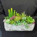W betonowej doniczce o kształcie kory drewna stworzono kompozycję z sukulentów, która łączy surowość materiału z naturalnym pięknem roślin. Nieregularna faktura doniczki imituje strukturę drewna, co wprowadza element organiczny i rustykalny do całości. Betonowa powierzchnia doniczki jest w odcieniach szarości, co stanowi subtelną bazę dla zielonych sukulentów.