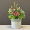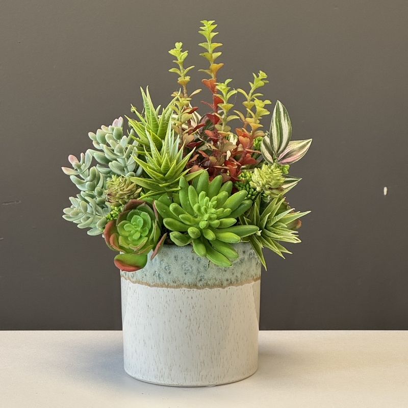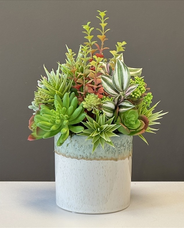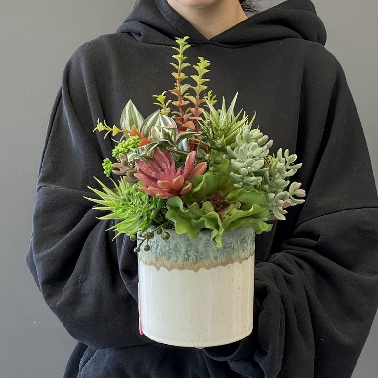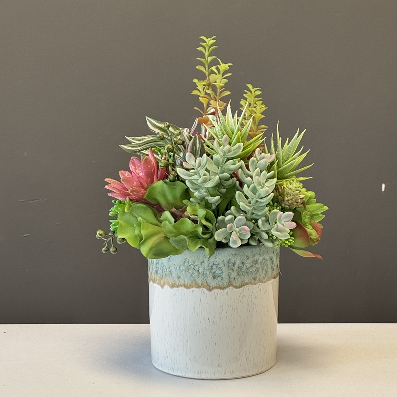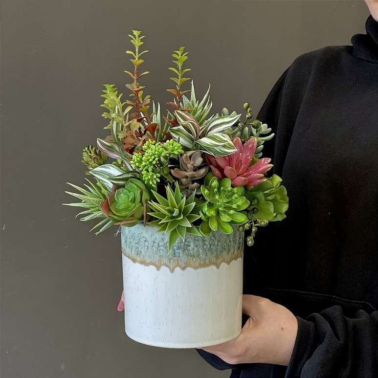 Oryginalna kompozycja roślinna, wykonana z wysokiej jakości roślin sztucznych, gumowanych sukulentów oraz ceramicznej donicy. Kaktusy są jakości premium, w wyglądzie i dotyku przypominają naturalne. Kompozycja idealnie sprawdzi się jako ozdoba mieszkań zarówno w stylu klasycznym oraz nowoczesnym. Poszczególne kompozycje mogą się minimalnie różnić układem roślin. Każda z nich jest wykonana niezwykle starannie, z zachowaniem proporcji i dopracowana w najdrobniejszych szczegółach.