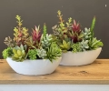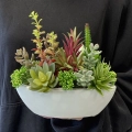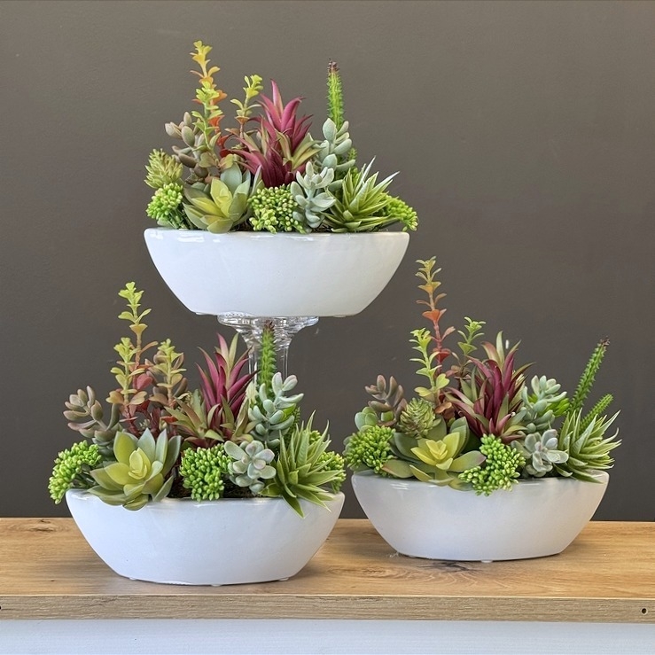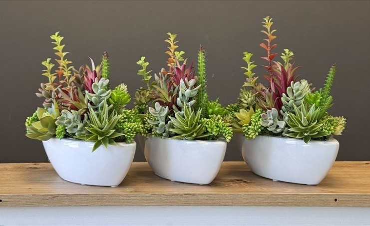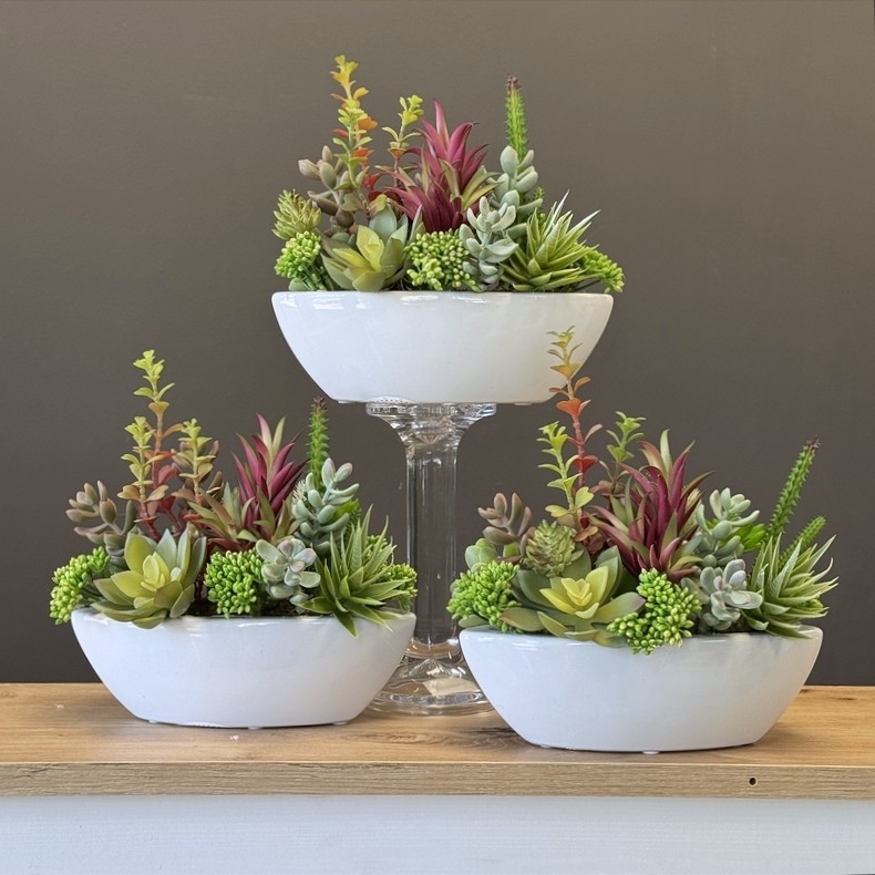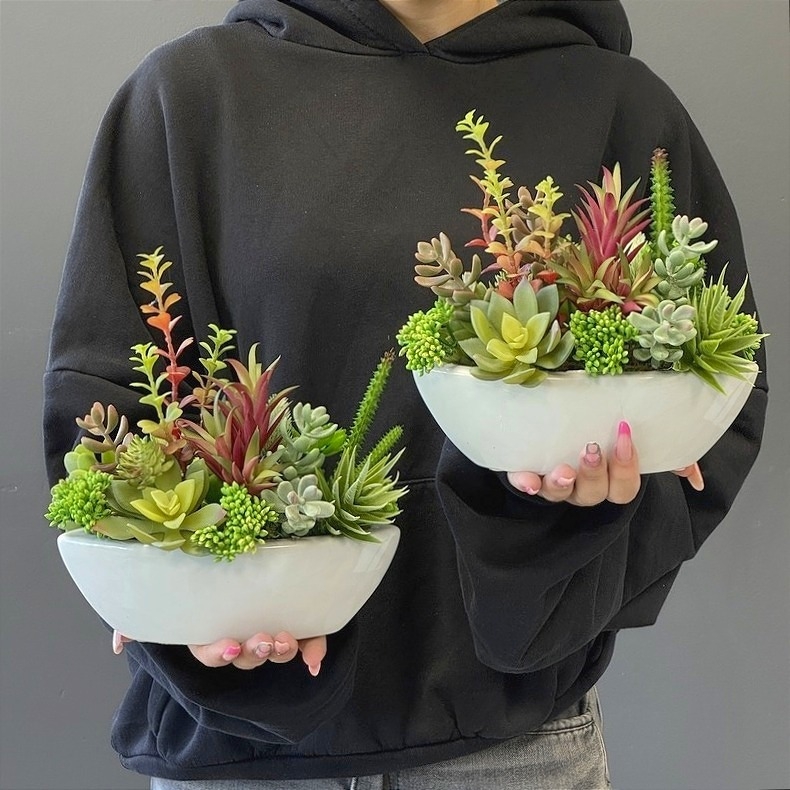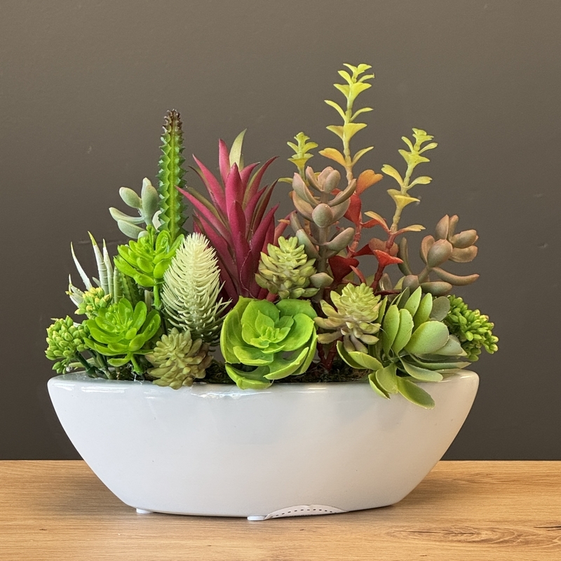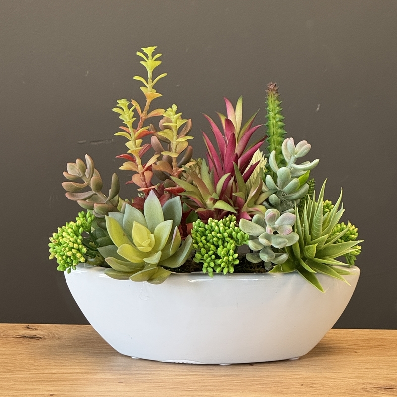 Niewielka kompozycja florystyczna stworzona z realistycznie odwzorowanych, wysokiej jakości sztucznych sukulentów, których zróżnicowany pokrój i kolorystyka nawiązują do naturalnych odmian tych roślin. Umieszczona w eleganckiej ceramicznej donicy o kształcie łódki, przyciąga uwagę swoją formą i starannością wykonania.