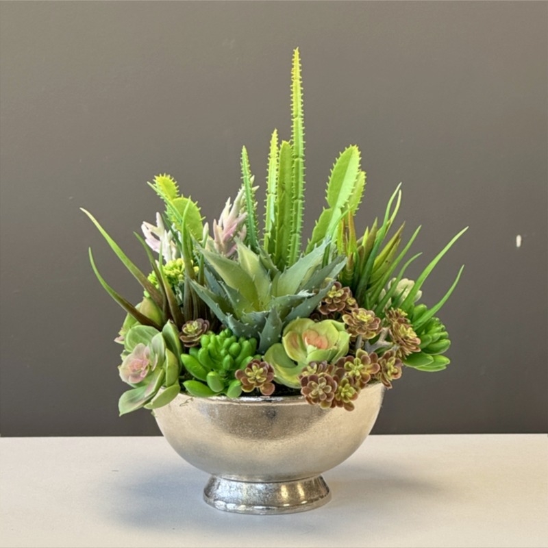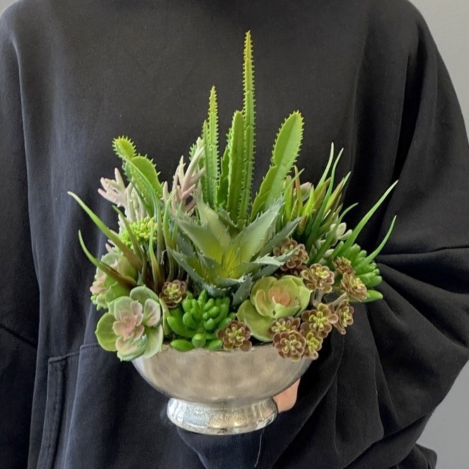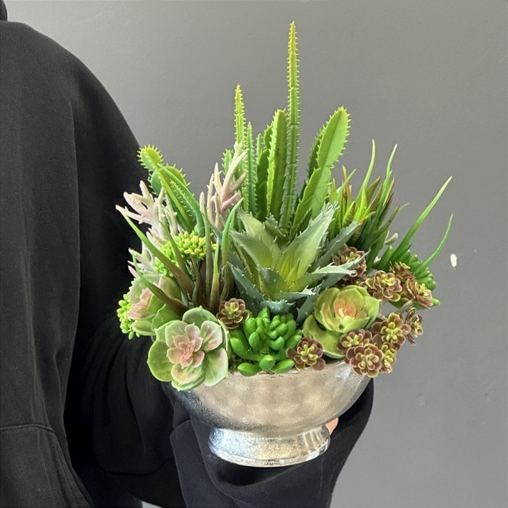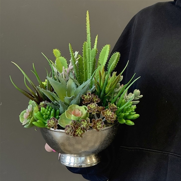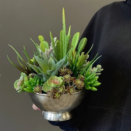 Oryginalna kompozycja roślinna, wykonana z wysokiej jakości roślin sztucznych, gumowanych sukulentów oraz ceramicznej donicy. Kaktusy są jakości premium, w wyglądzie i dotyku przypominają naturalne. Kompozycja idealnie sprawdzi się jako ozdoba mieszkań zarówno w stylu klasycznym oraz nowoczesnym. Poszczególne kompozycje mogą się minimalnie różnić układem roślin. Każda z nich jest wykonana niezwykle starannie, z zachowaniem proporcji i dopracowana w najdrobniejszych szczegółach.