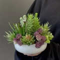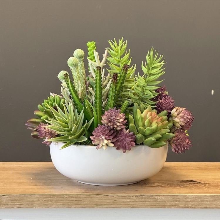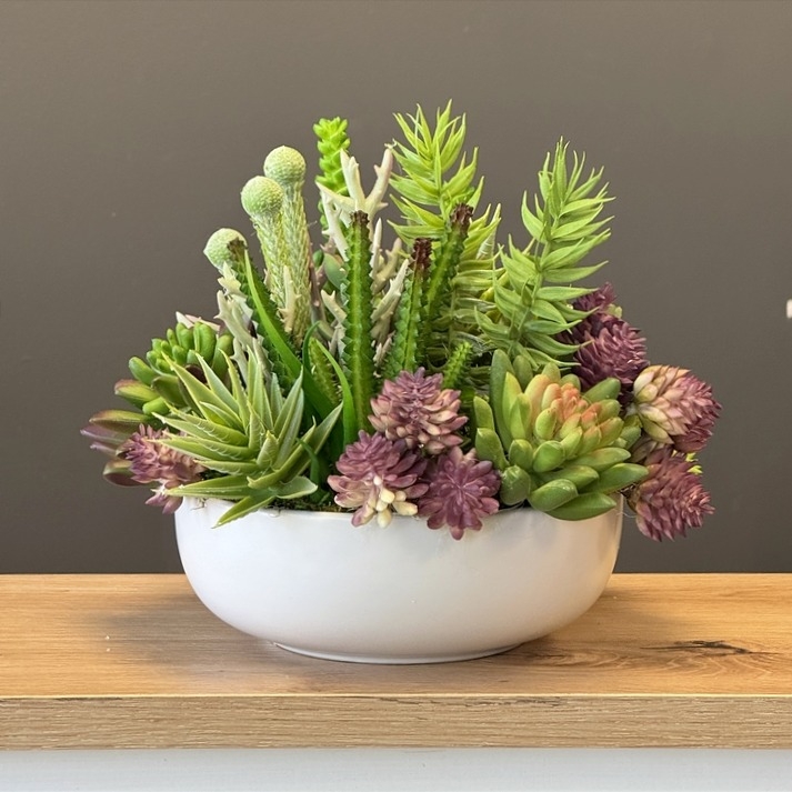 Oryginalna kompozycja roślinna, wykonana z wysokiej jakości roślin sztucznych, gumowanych sukulentów oraz ceramicznej donicy. Kaktusy są jakości premium, w wyglądzie i dotyku przypominają naturalne. Kompozycja idealnie sprawdzi się jako ozdoba mieszkań zarówno w stylu klasycznym oraz nowoczesnym. Poszczególne kompozycje mogą się minimalnie różnić układem roślin. Każda z nich jest wykonana niezwykle starannie, z zachowaniem proporcji i dopracowana w najdrobniejszych szczegółach.