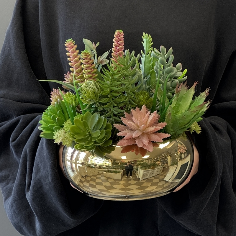Oryginalna kompozycja roślinna, wykonana z wysokiej jakości roślin sztucznych, gumowanych sukulentów oraz ceramicznej donicy. Kaktusy są jakości premium, w wyglądzie i dotyku przypominają naturalne. Kompozycja idealnie sprawdzi się jako ozdoba mieszkań zarówno w stylu klasycznym oraz nowoczesnym. Poszczególne kompozycje mogą się minimalnie różnić układem roślin. Każda z nich jest wykonana niezwykle starannie, z zachowaniem proporcji i dopracowana w najdrobniejszych szczegółach.