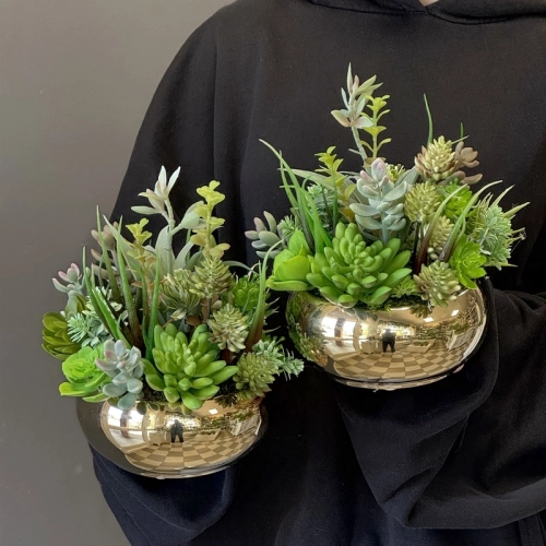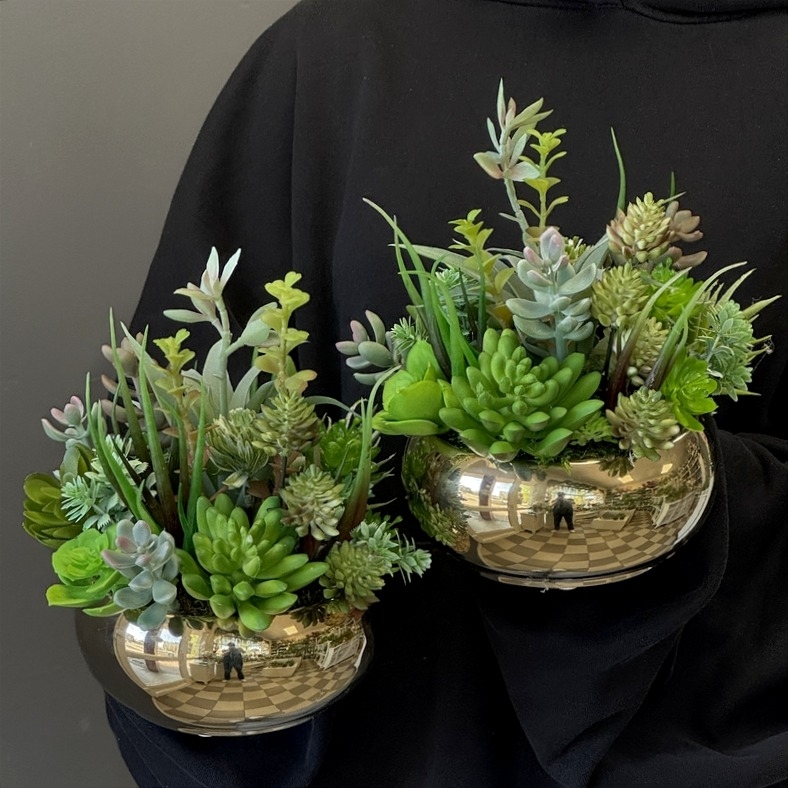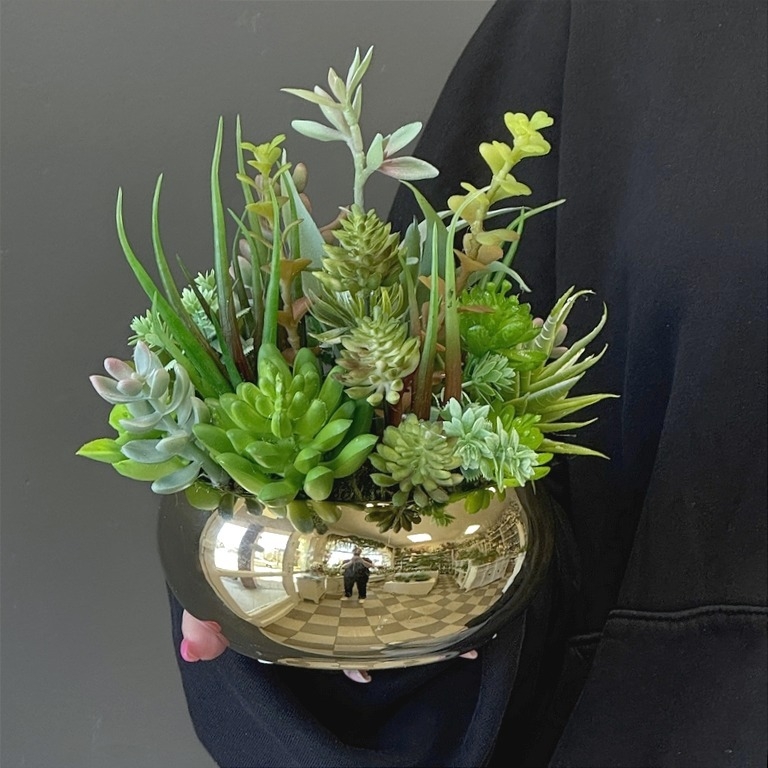 Oryginalna kompozycja roślinna, wykonana z wysokiej jakości roślin sztucznych, gumowanych sukulentów oraz ceramicznej donicy. Kaktusy są jakości premium, w wyglądzie i dotyku przypominają naturalne. Kompozycja idealnie sprawdzi się jako ozdoba mieszkań zarówno w stylu klasycznym oraz nowoczesnym. Poszczególne kompozycje mogą się minimalnie różnić układem roślin. Każda z nich jest wykonana niezwykle starannie, z zachowaniem proporcji i dopracowana w najdrobniejszych szczegółach.