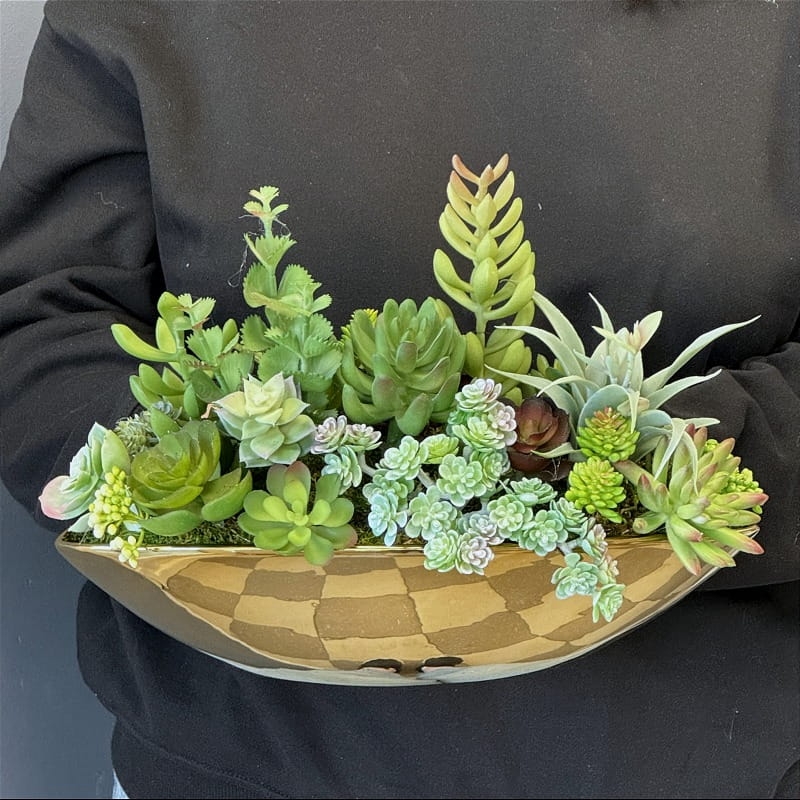 Oryginalna kompozycja roślinna wykonana z wysokiej jakości sztucznych sukulentów, wiernie odwzorowujących wygląd naturalnych roślin. Zastosowano sukulenty o zróżnicowanym pokroju, strukturze i kolorystyce, imitujące różne gatunki występujące w naturze. Rośliny osadzono prostokątnej donicy ceramicznej, której uniwersalna forma sprawia, że doskonale sprawdza się na wąskich półkach, parapetach czy komodach.