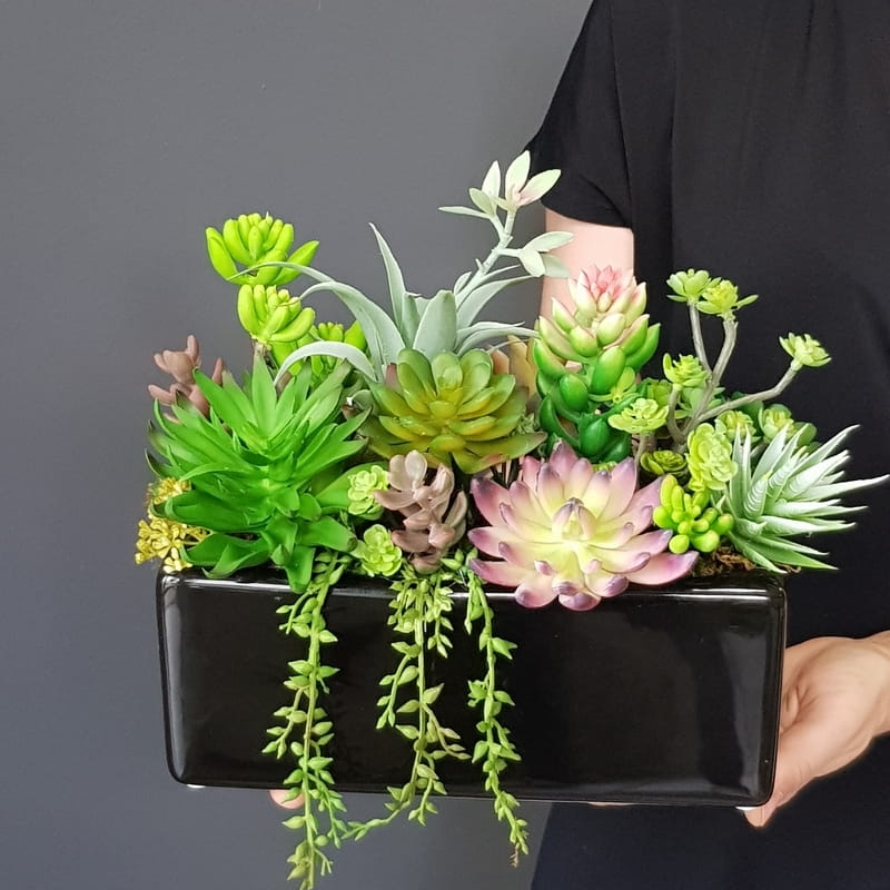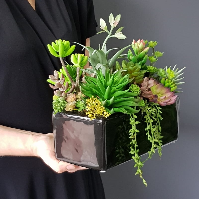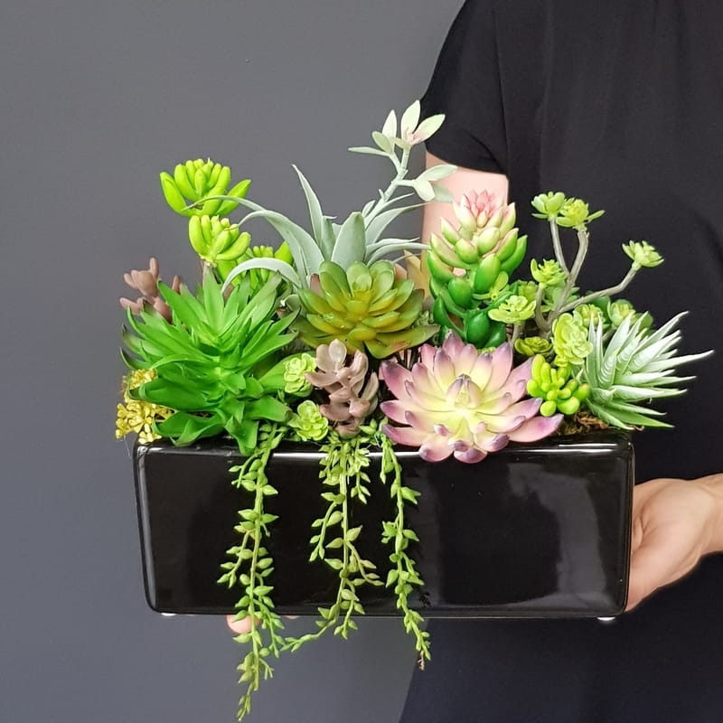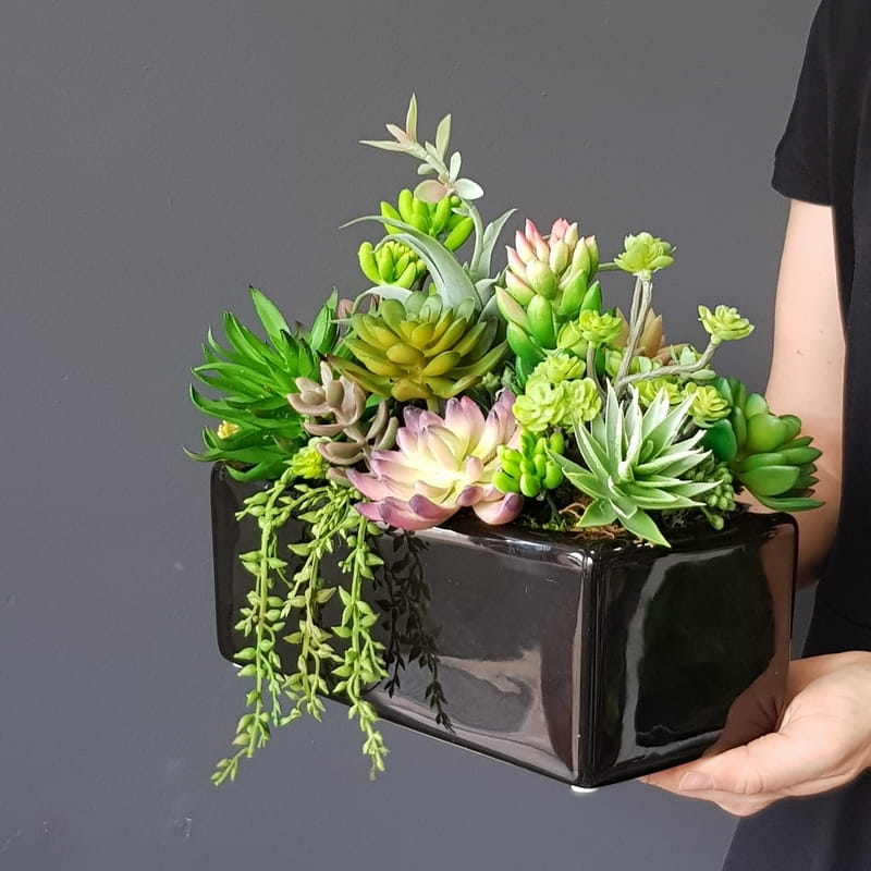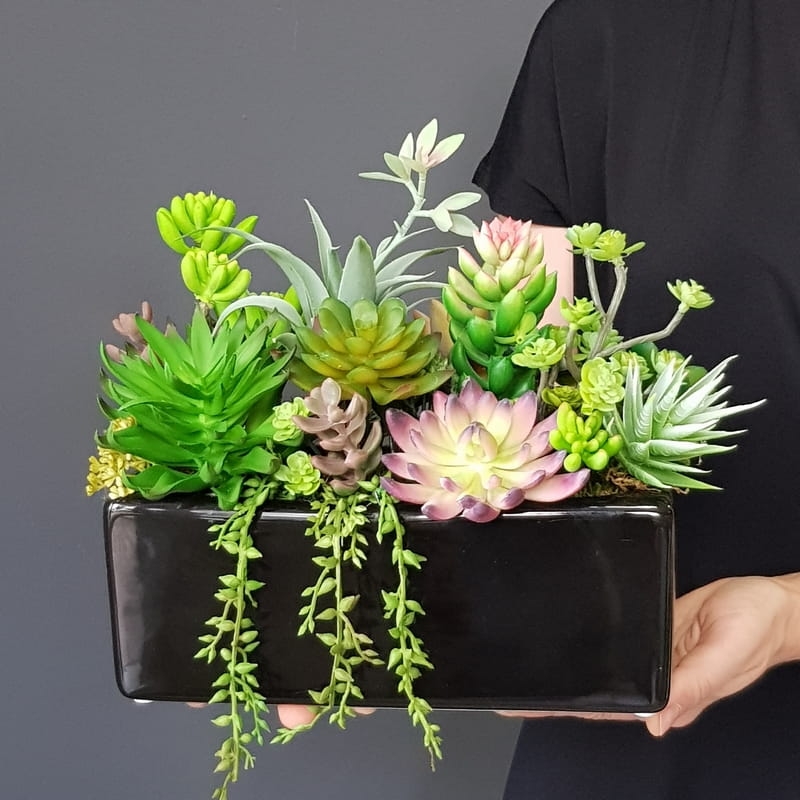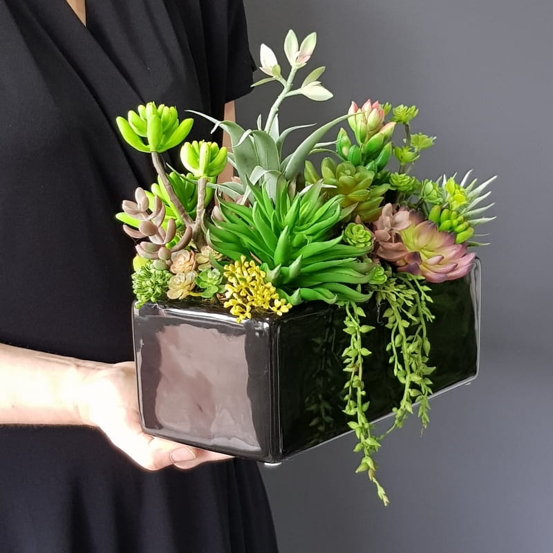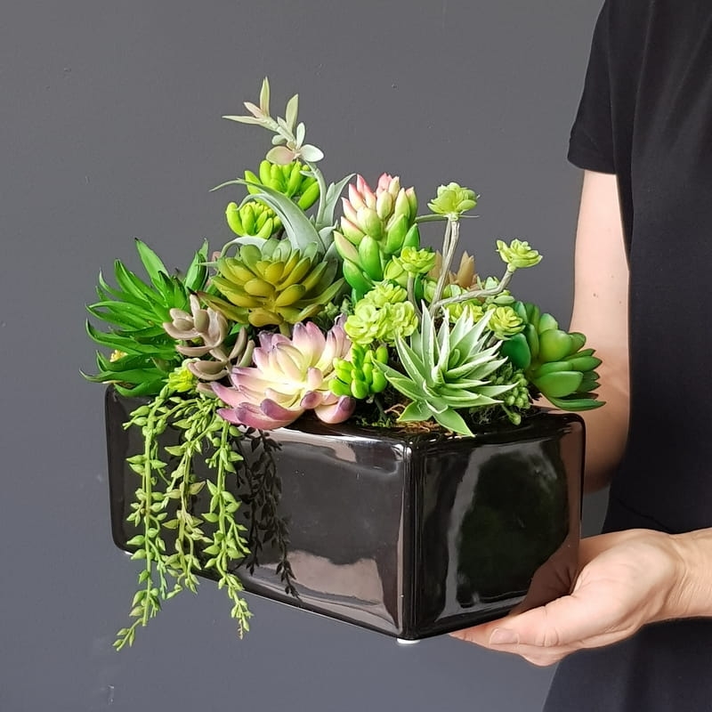 Oryginalna kompozycja roślinna, wykonana z wysokiej jakości roślin sztucznych, gumowanych sukulentów oraz ceramicznej donicy. Kaktusy są jakości premium, w wyglądzie i dotyku przypominają naturalne. Kompozycja idealnie sprawdzi się jako ozdoba mieszkań zarówno w stylu klasycznym oraz nowoczesnym. Poszczególne kompozycje mogą się minimalnie różnić układem roślin. Każda z nich jest wykonana niezwykle starannie, z zachowaniem proporcji i dopracowana w najdrobniejszych szczegółach.